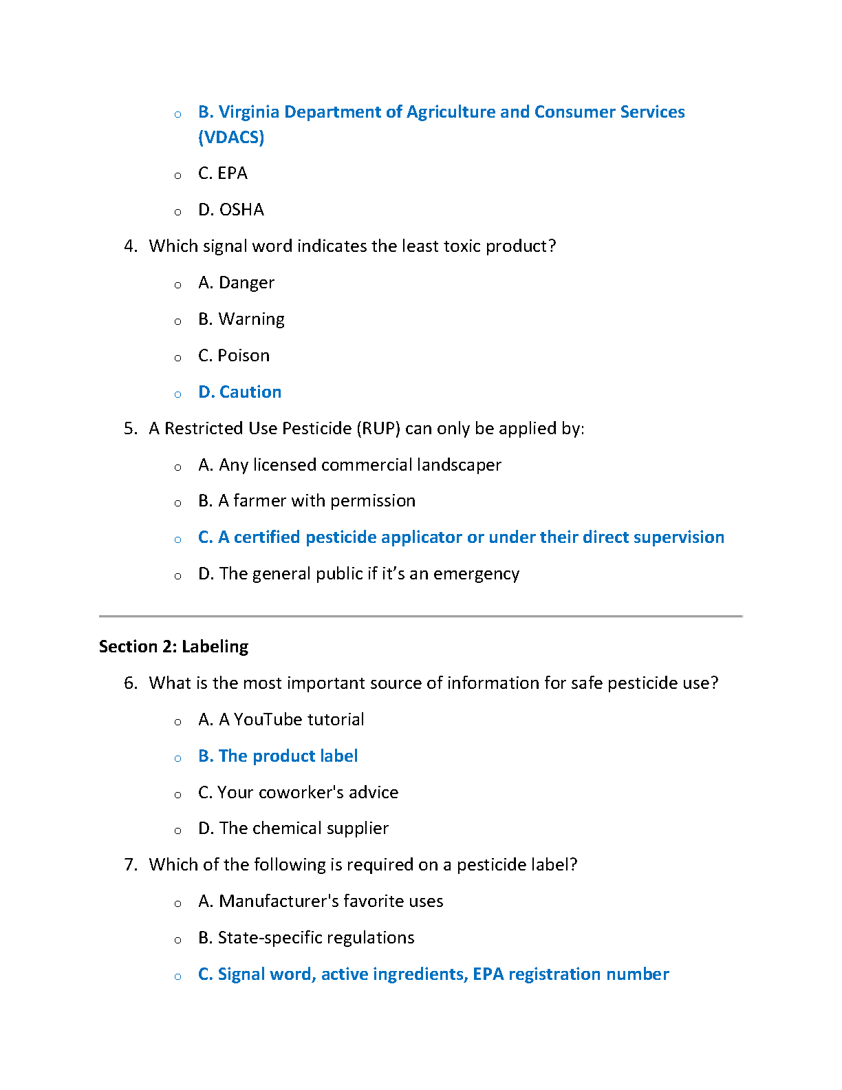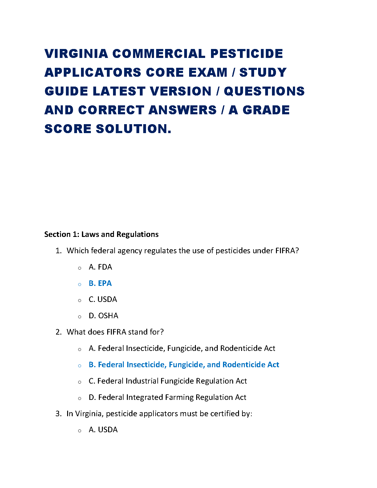 Ace your Virginia Commercial Pesticide Applicators Core Exam with ease! This comprehensive study guide is your ultimate tool for success, meticulously updated for the 2025/2026 testing cycle. It functions as a complete test bank, featuring a vast collection of exam-style questions paired with verified, correct answers. Dive deep into crucial sections, including Laws and Regulations, to build a solid understanding of the material. Our A-grade solution format is designed to help you study efficiently, master the concepts, and pass your exam on the first attempt, securing your certification without the stress of resits.