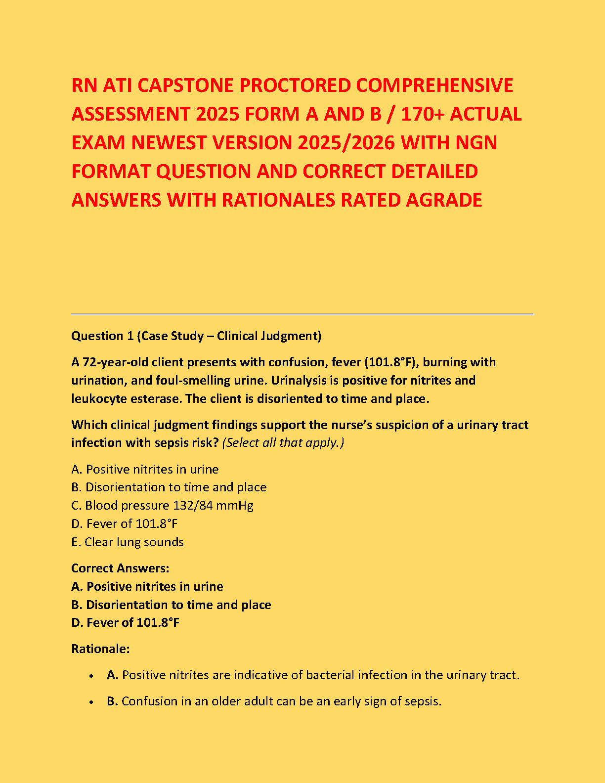 Excel on your ATI Capstone with our premier 2025/2026 Test Bank for the RN Proctored Comprehensive Assessment. This essential study resource provides over 170 meticulously curated questions covering both Form A and Form B. Updated to the latest Next Generation NCLEX (NGN) format, our guide helps you master clinical judgment. Every question is paired with a verified correct answer and an in-depth rationale, ensuring you not only learn the answer but understand the 'why' behind it. Prepare effectively, boost your confidence, and pass your exam on the first try with this A-grade rated study tool.