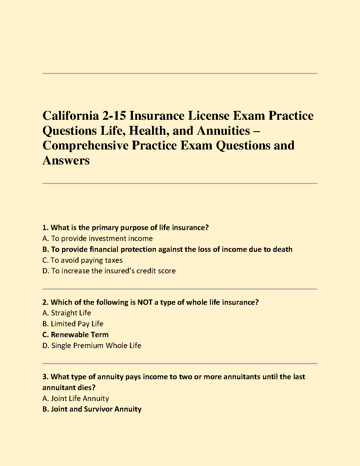Get ready to ace your California 2-15 Insurance License Exam with our comprehensive test bank. This essential study guide is packed with practice questions and detailed answers covering all critical topics in Life, Health, and Annuities. Designed to mirror the actual exam format, this resource will help you build confidence, master the material, and pass on your first attempt. Stop worrying about resits and start your insurance career with the best preparation tool available.