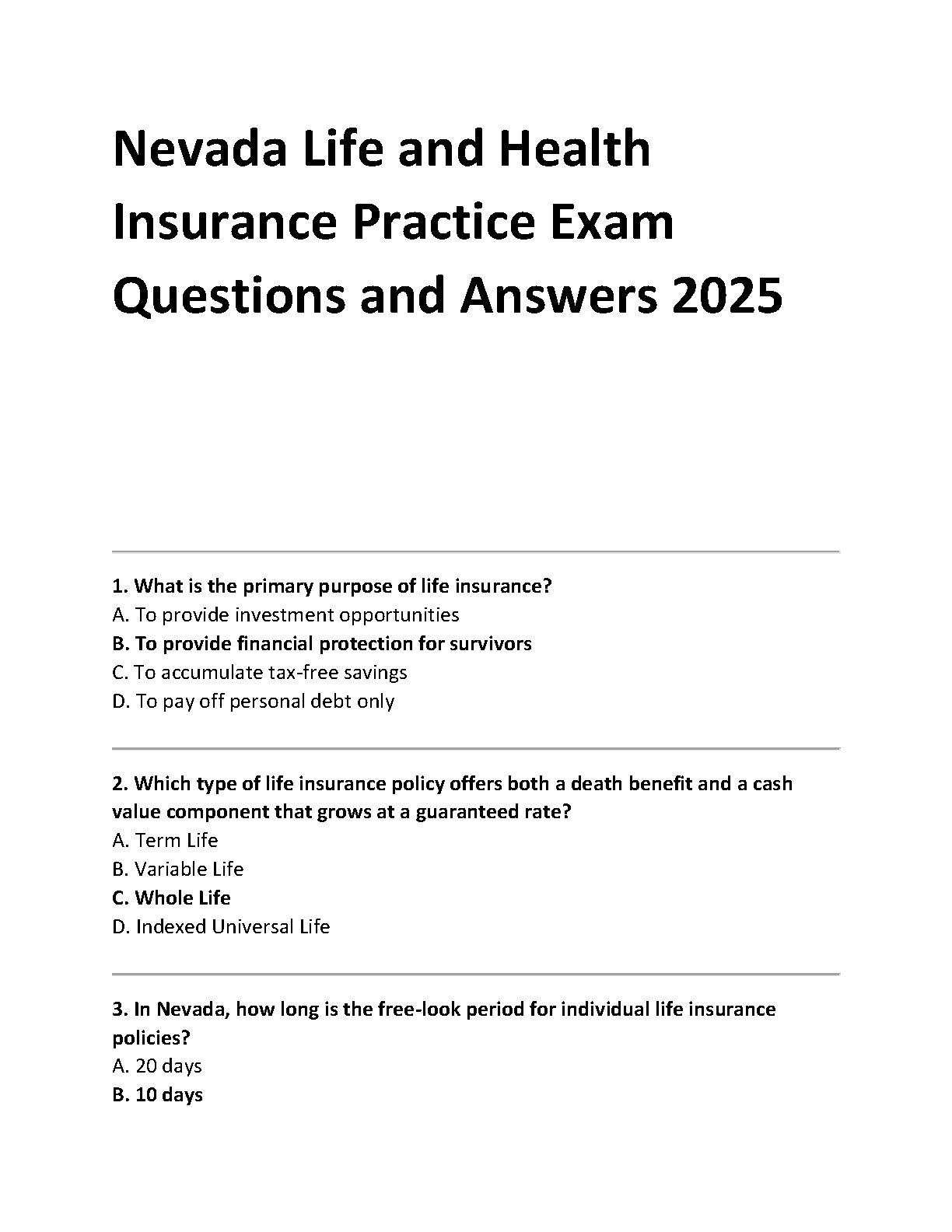 Nevada Life and Health Insurance Exam 2025-2026 Test Bank: Practice Questions & Verified Answers to Pass on Your First Try