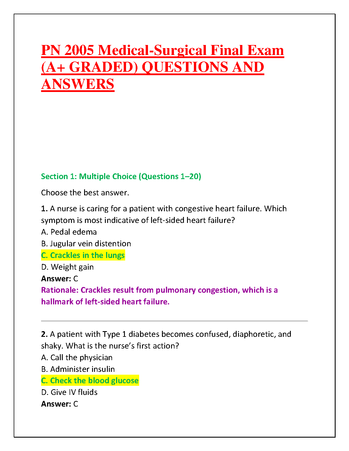 Ace your PN 2005 Medical-Surgical Final Exam with our comprehensive and A+ graded test bank. This essential study guide provides a complete set of final exam questions, each paired with a verified correct answer and a detailed rationale. Designed specifically for practical nursing students, this resource covers all critical topics you'll face on the exam, helping you to understand complex concepts, not just memorize answers. Prepare effectively, boost your confidence, and secure top grades. This is the ultimate tool to help you pass your Med-Surg final on your first try.