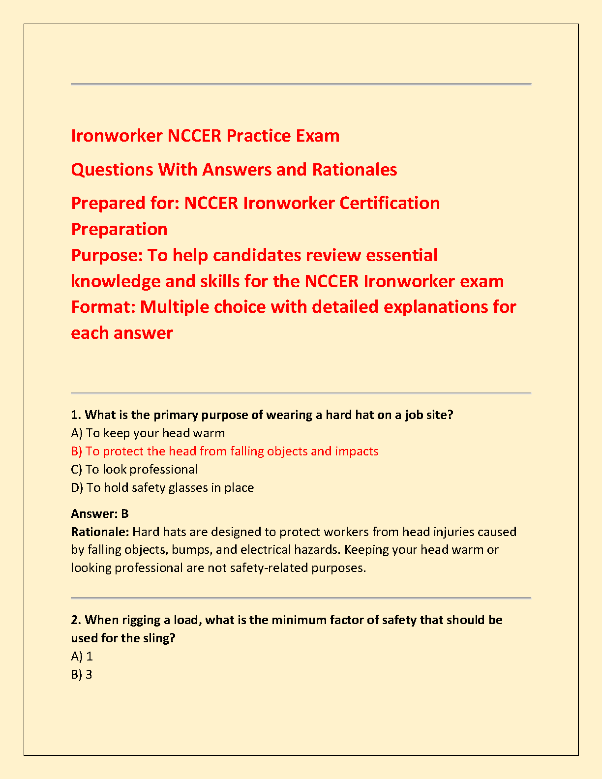 Ace your NCCER Ironworker Certification Exam on the first try with this comprehensive test bank, fully updated for the 2025/2026 academic year. This essential study guide is expertly crafted to help you master the crucial knowledge and skills required for certification, eliminating the need for expensive resits. Featuring a wide array of multiple-choice questions that reflect the real exam format, each problem is paired with a correct answer and a detailed rationale. This resource allows you to thoroughly review key concepts, pinpoint your weaknesses, and build the confidence needed to excel. Prepare effectively and achieve your NCCER Ironworker certification with this ultimate success tool.