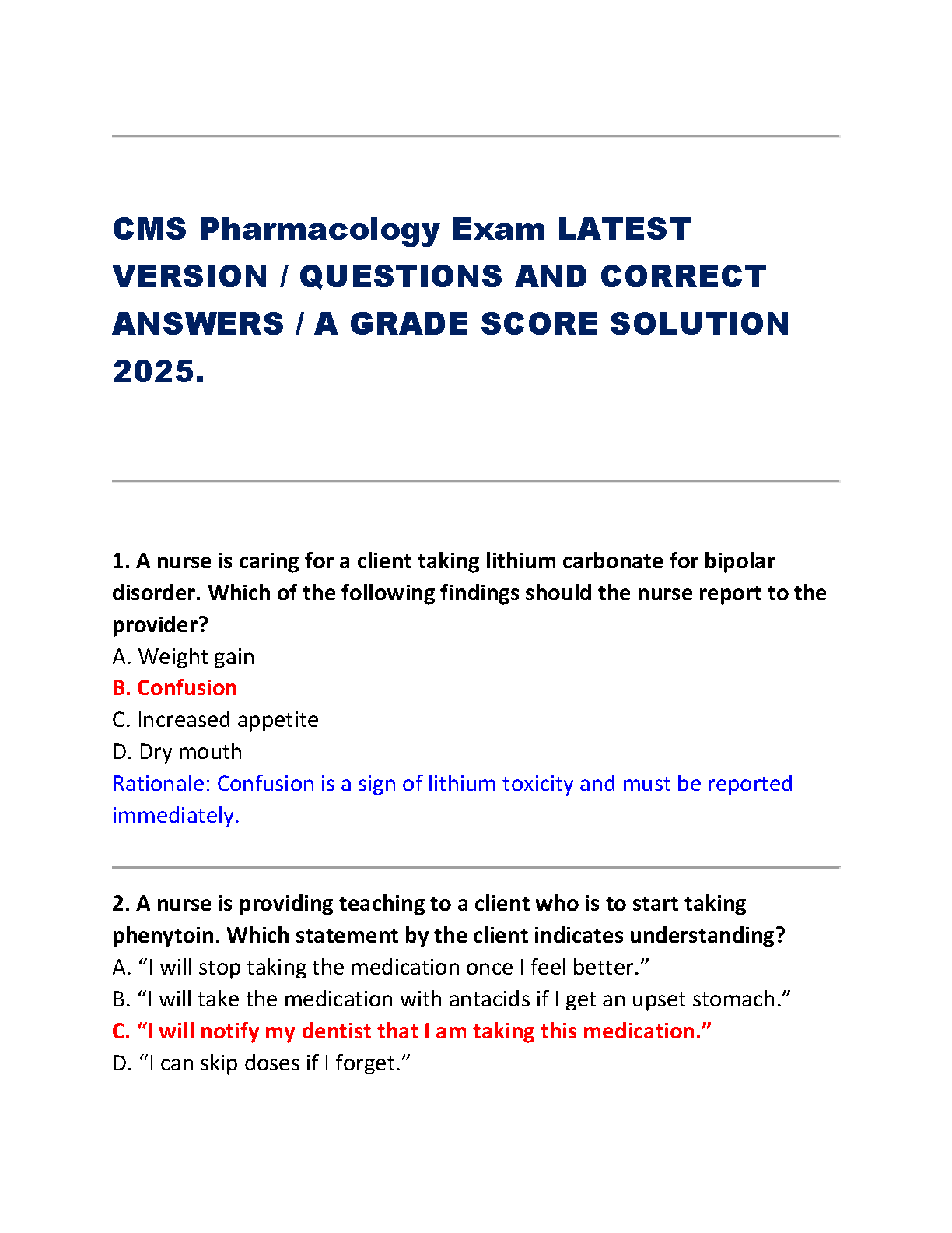 Latest 2025 CMS Pharmacology Test Bank: Verified Questions, Answers, and Rationales to Ace Your Exam