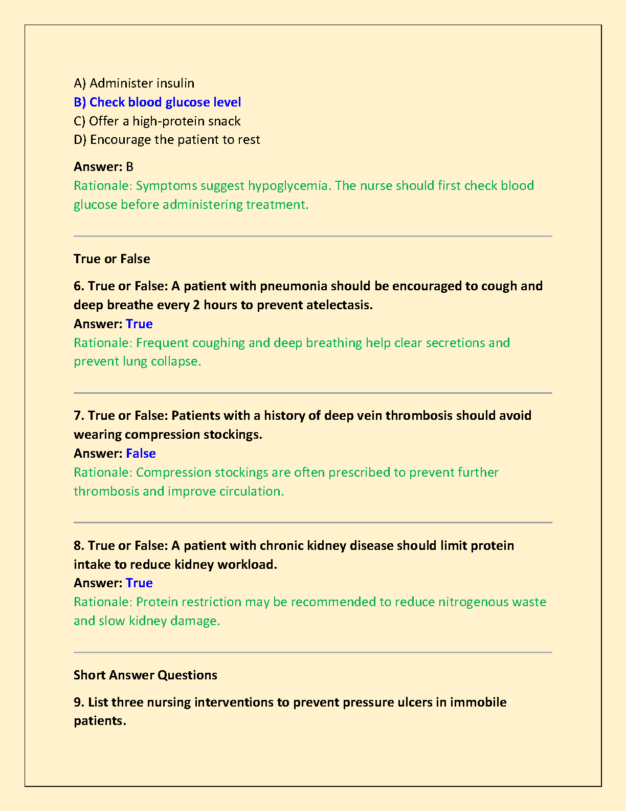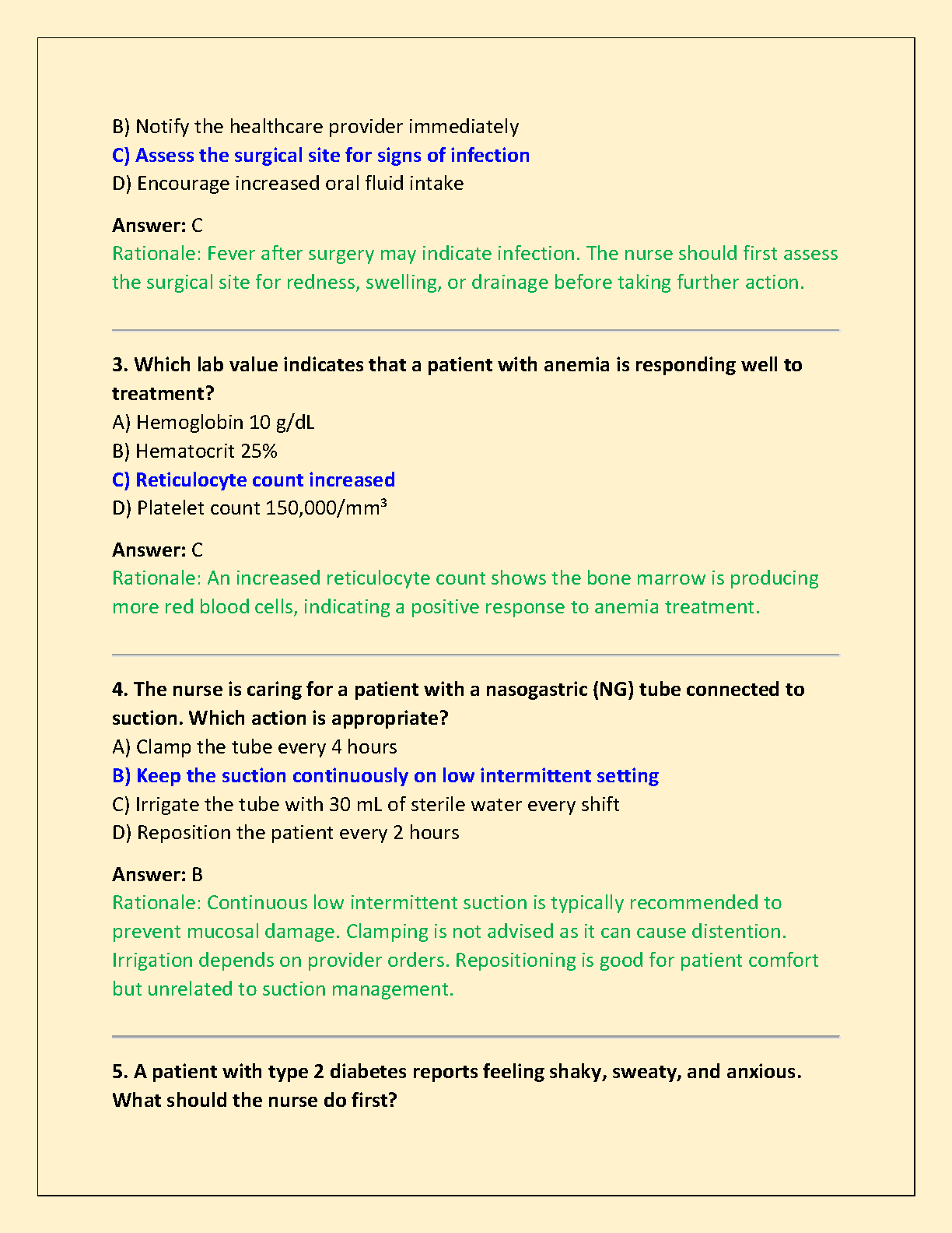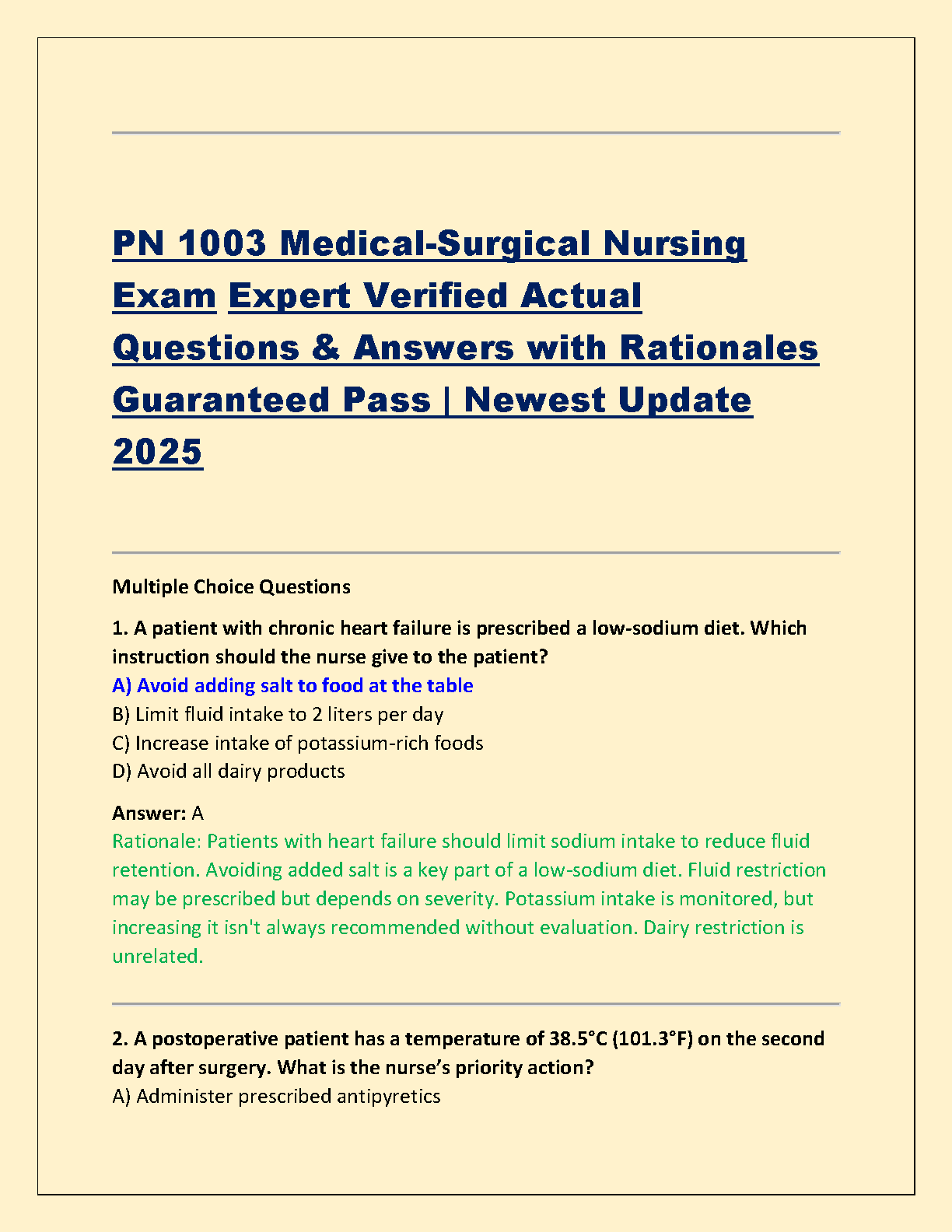 Prepare to excel in your PN 1003 Medical-Surgical Nursing course with our latest 2025-2026 test bank. This comprehensive resource is packed with expert-verified, exam-style multiple-choice questions, complete with detailed answers and in-depth rationales. Each question is designed to mirror the actual exam, helping you master critical concepts, identify knowledge gaps, and build the confidence needed to pass on your first attempt. Stop stressing about resits and start studying smarter. Download now and take the first step towards acing your medical-surgical nursing exam!