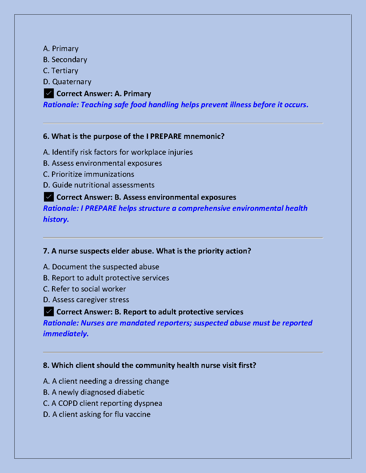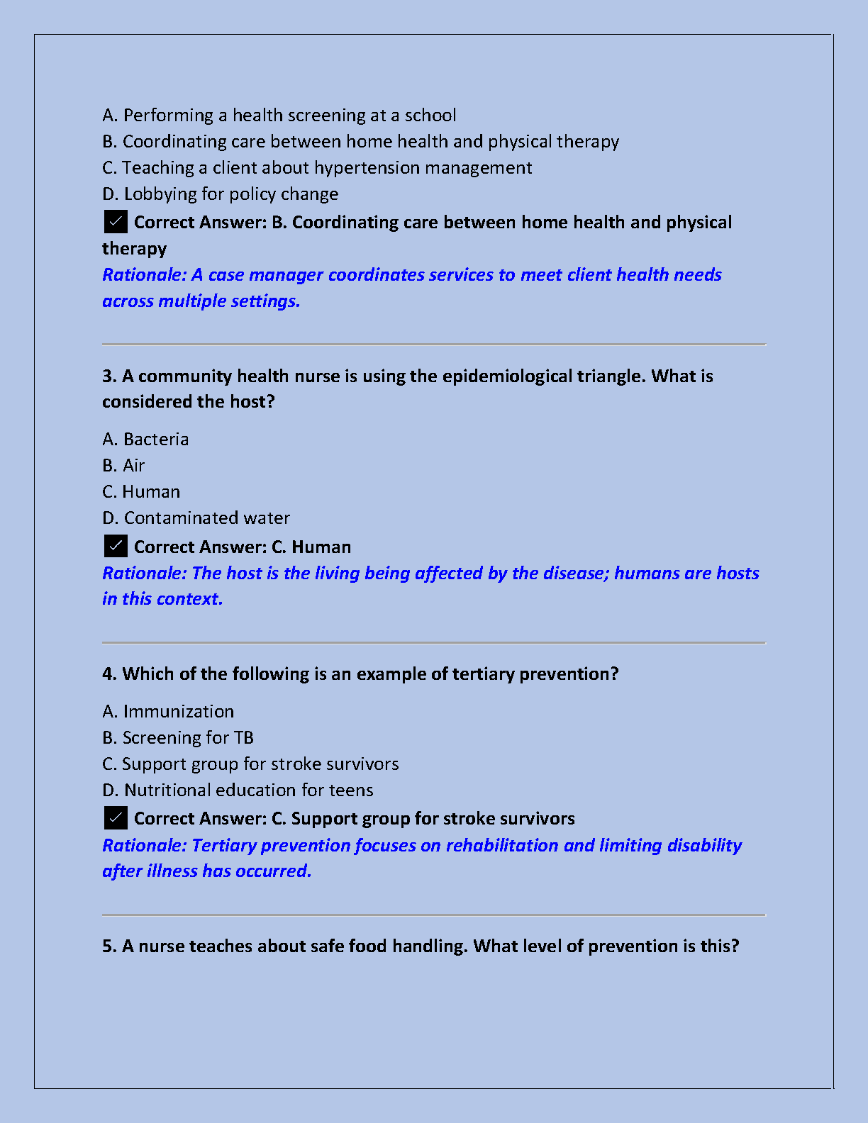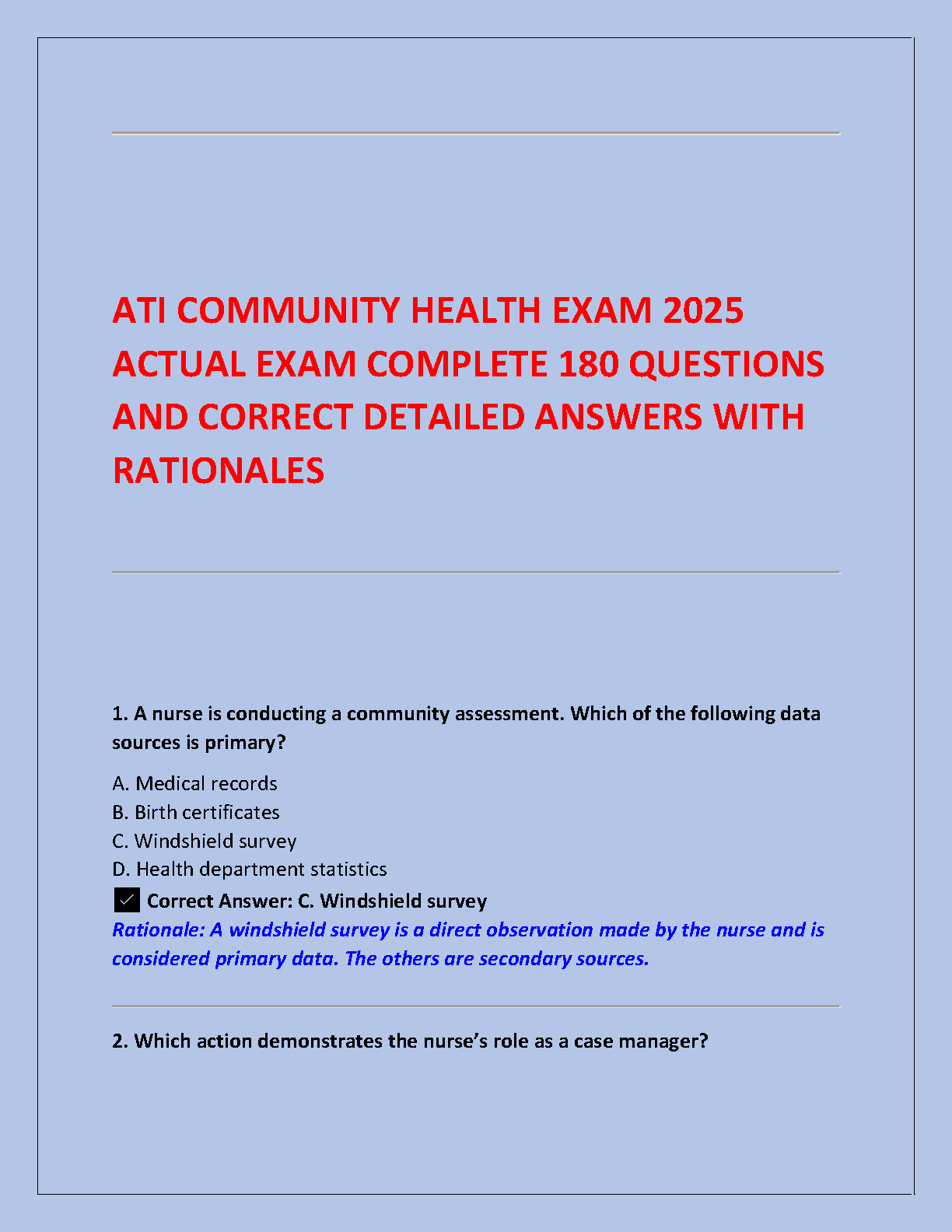 Prepare to ace your ATI Community Health Exam with our latest 2025-2026 study guide! This comprehensive resource features 180 practice questions meticulously crafted to mirror the actual exam. Each question comes with a correct answer and a detailed rationale, ensuring you not only know the right answer but also understand the core concepts behind it. This guide is your ultimate tool to build confidence, master key topics in community health nursing, and successfully pass your exam on the very first try, saving you from the stress of resits. Get immediate access to this essential study material and take a confident step towards your nursing career.