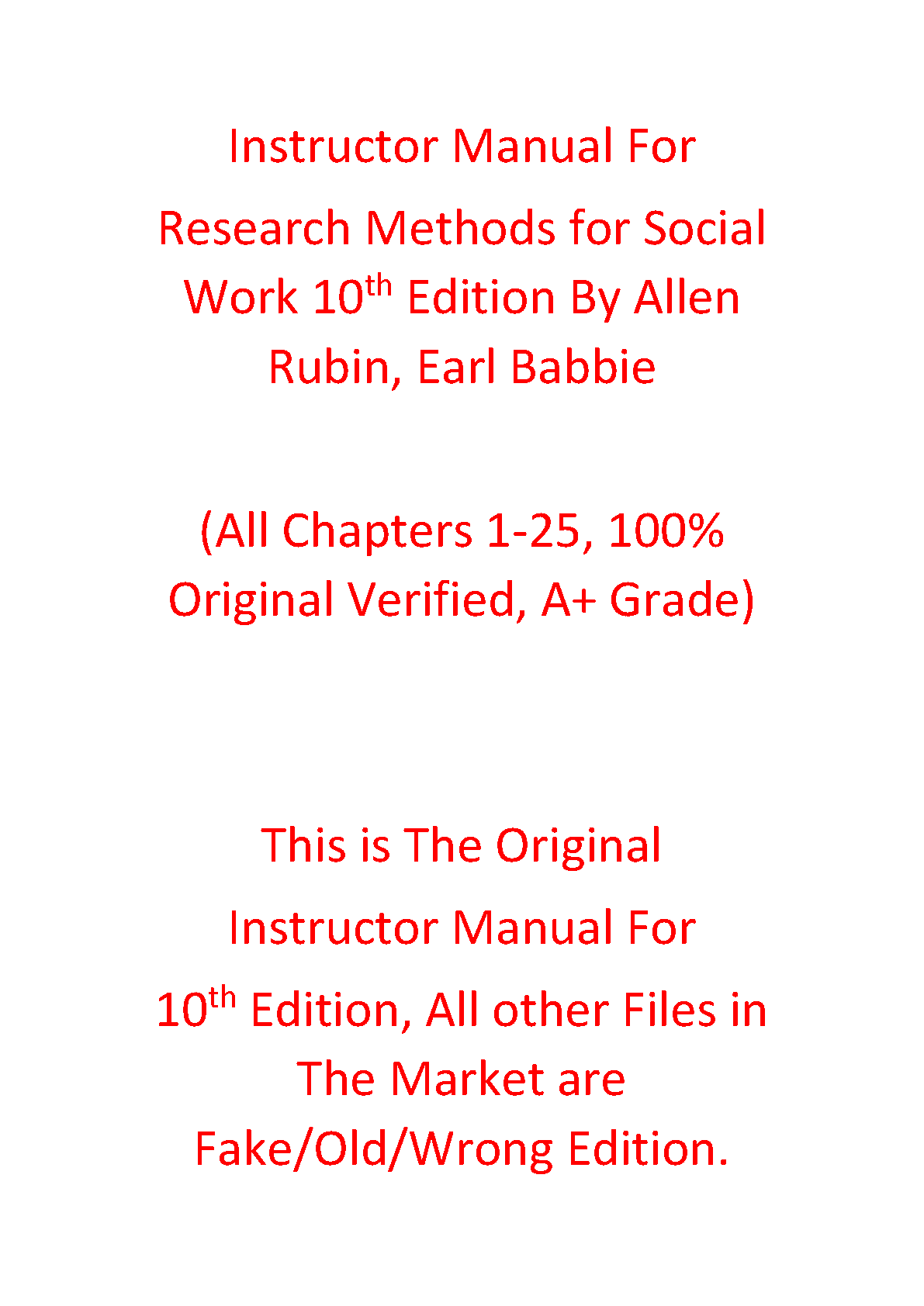 Gain an unparalleled edge in your studies with the official Instructor Manual for 'Research Methods for Social Work, 10th Edition' by Allen Rubin and Earl Babbie. This comprehensive resource covers all 25 chapters, providing detailed teaching guides, discussion points, and valuable insights directly from the publisher. Verified for authenticity and accuracy, this is the exact manual used by instructors, ensuring you have the A+ grade material needed to master the course content. Don't settle for incomplete or outdated versions; get the complete, original 10th Edition instructor manual and excel in your social work research methods course.