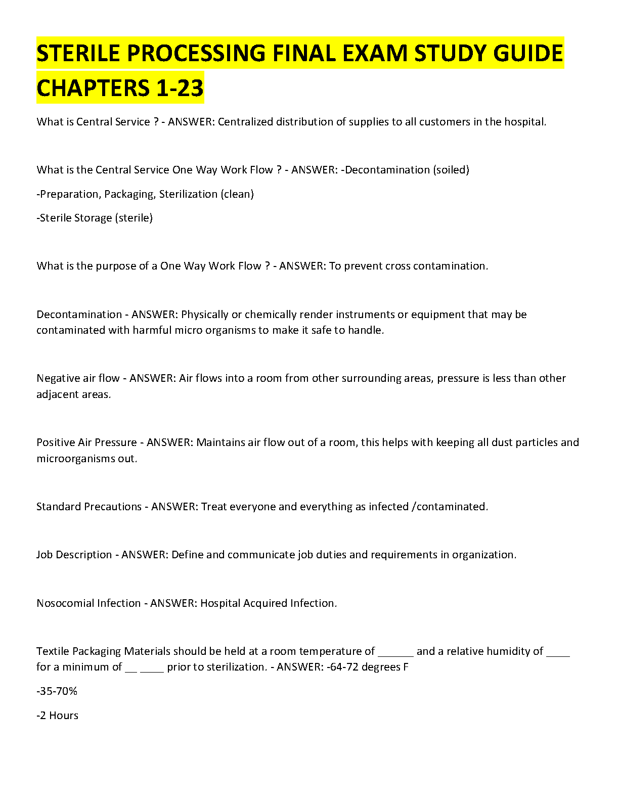 Master the essentials of sterile processing and walk into your final exam with confidence! This comprehensive study guide for the 2025/2026 academic year covers all critical topics from Chapters 1-23. Dive deep into key concepts including Central Service workflow, the one-way flow for decontamination, sterilization protocols, standard precautions, and the prevention of nosocomial infections. Our expertly crafted question-and-answer format simplifies complex topics, making it the perfect resource to help you pass your sterile processing exam on the very first attempt and avoid costly resits.