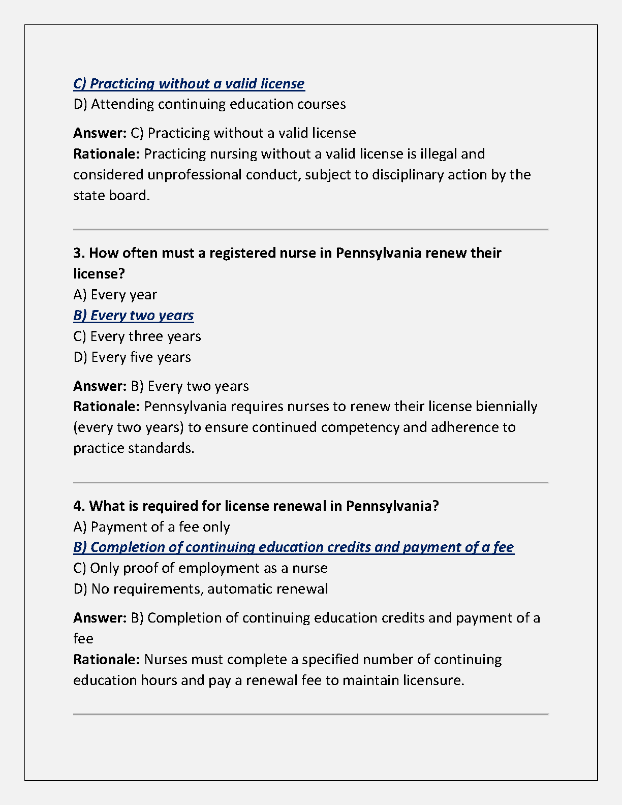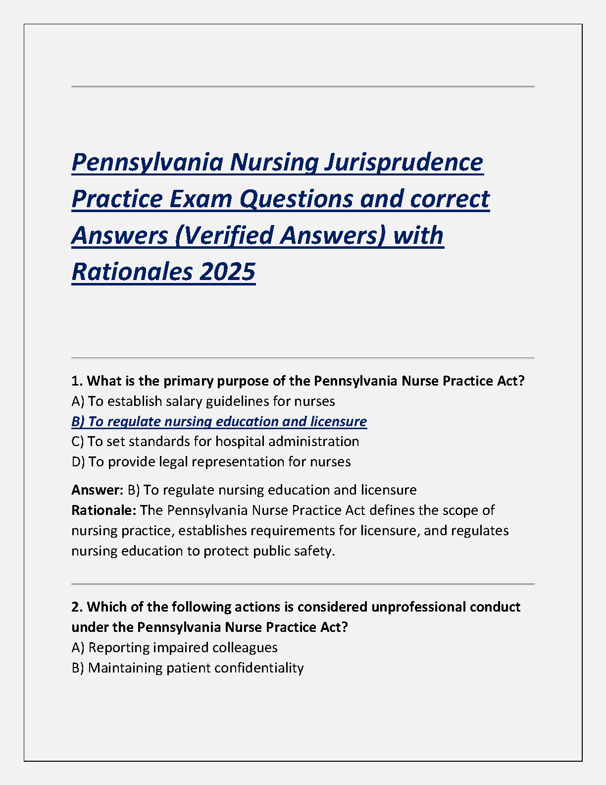 Ace your Pennsylvania Nursing Jurisprudence Exam on the first try! This comprehensive 2025 test bank is packed with practice questions covering all essential aspects of the Pennsylvania Nurse Practice Act. Each question includes a verified answer and a detailed rationale, ensuring you deeply understand the legal and ethical principles of nursing in Pennsylvania. Master the material, build your confidence, and pass your exam with ease. This is the ultimate study guide to help you succeed on your first attempt and avoid costly resits.