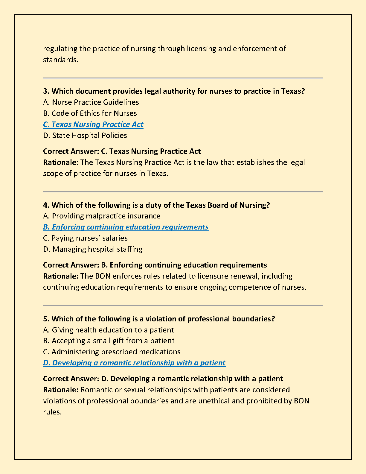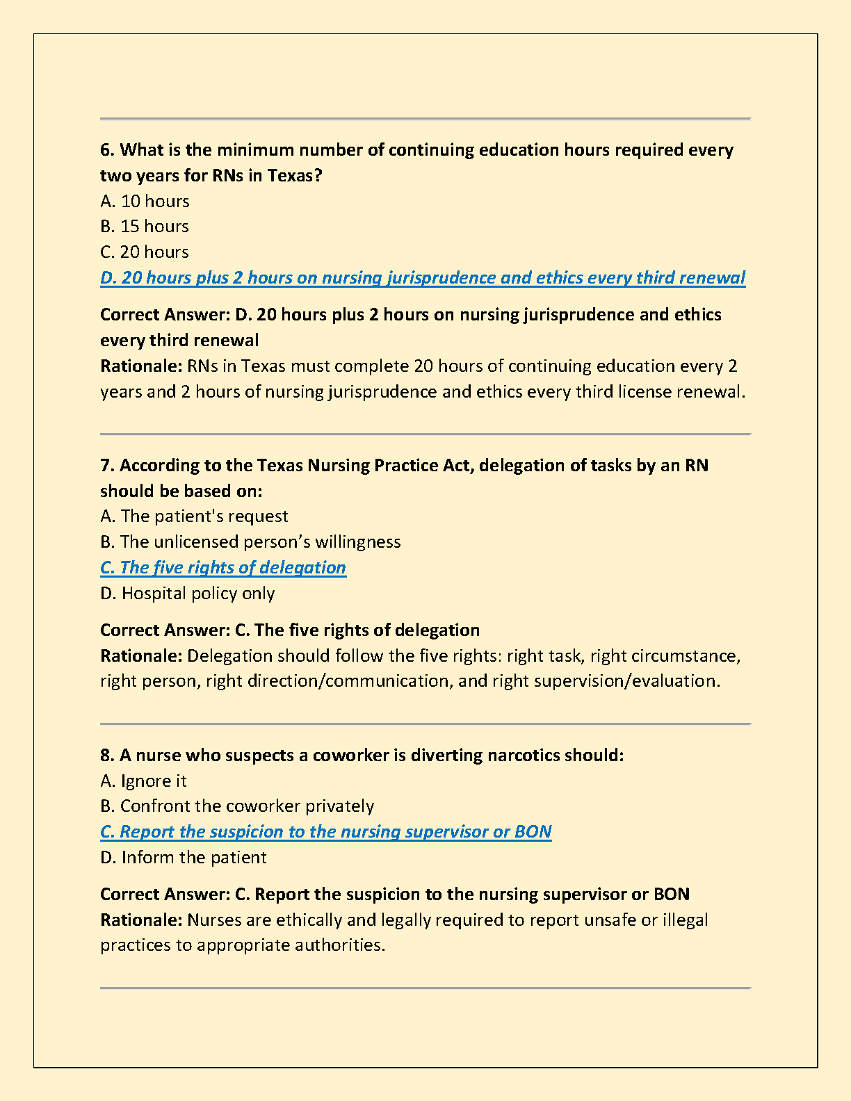 Master the Texas Nursing Jurisprudence Exam (NPE) on your first try with our comprehensive 2025 Test Bank. This essential study guide features a complete set of practice questions, 100% verified correct answers, and in-depth rationales for every question. Designed for the 2025/2026 academic year, this resource covers all critical topics required by the Texas Board of Nursing, helping you understand the laws and rules governing nursing practice in Texas. Avoid resits and pass with confidence using this expertly prepared practice exam.