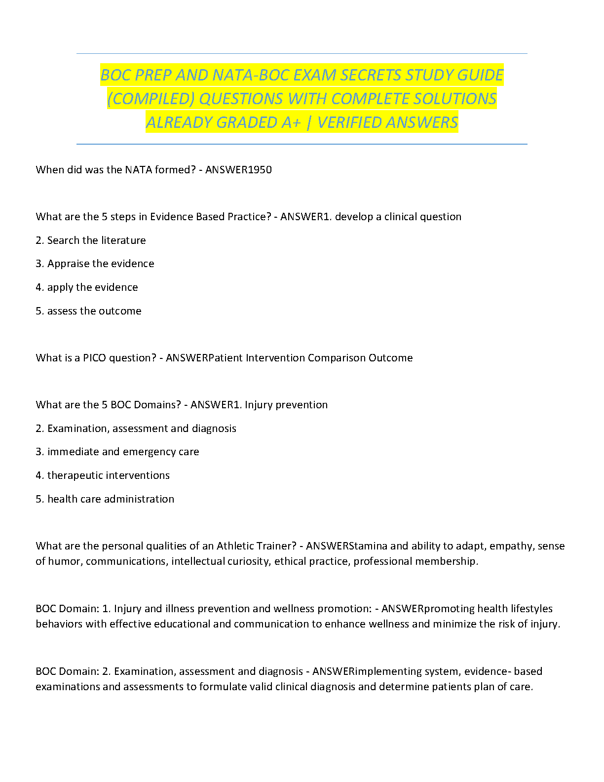 Unlock your potential and ace the Board of Certification (BOC) exam with our definitive Test Bank for the NATA-BOC Exam Secrets Study Guide, fully updated for the 2025-2026 session. This resource is packed with a comprehensive collection of verified questions and detailed, A+ graded solutions, meticulously compiled to cover every critical area of the exam. Dive deep into all 5 BOC domains: Injury/Illness Prevention, Examination and Diagnosis, Immediate and Emergency Care, Therapeutic Intervention, and Healthcare Administration. This study guide is your ultimate tool to build confidence and ensure you pass your athletic trainer certification on the very first attempt, avoiding costly resits.