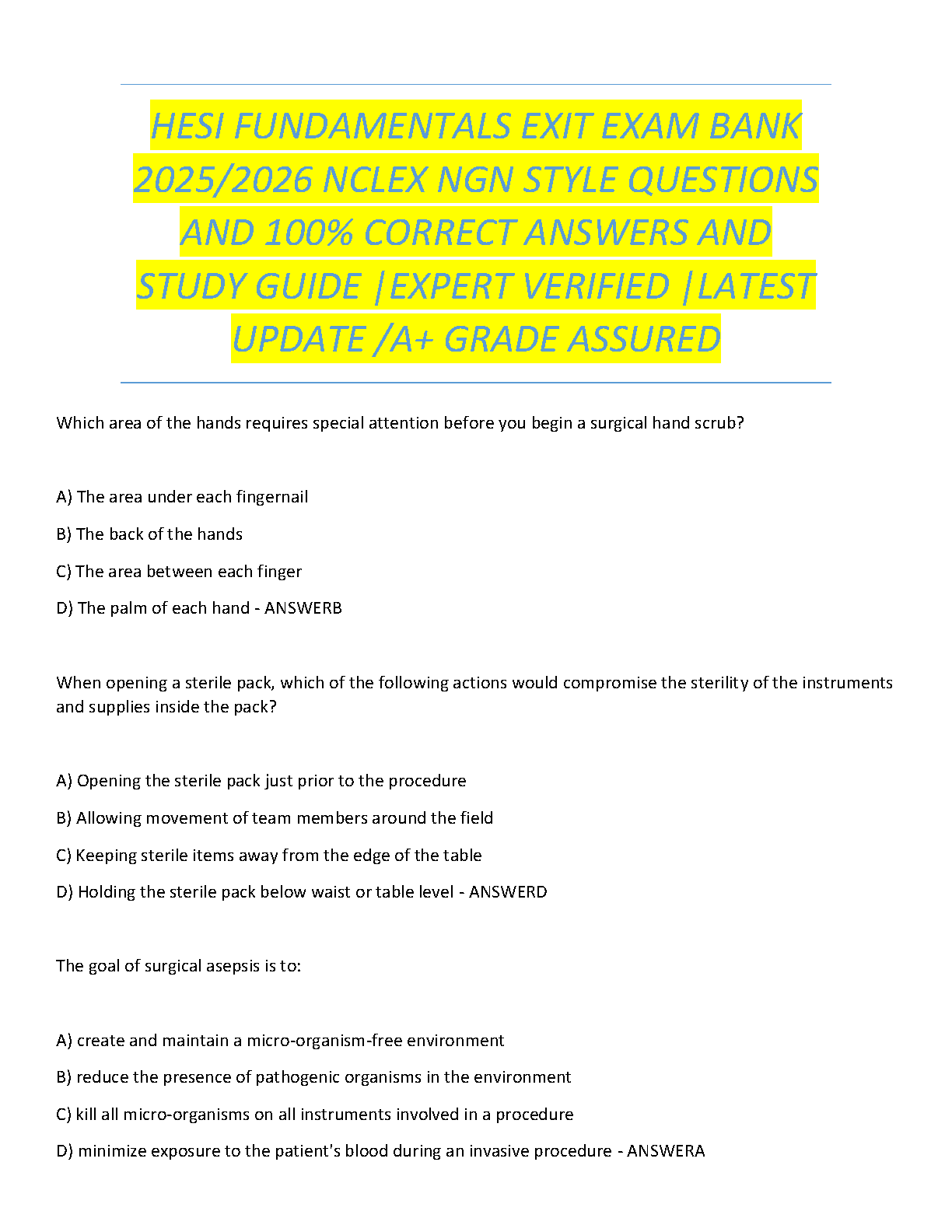 Unlock your path to success with our comprehensive HESI Fundamentals Exit Exam Bank for the 2025-2026 academic year. This expert-verified study guide is meticulously designed to help you master the core concepts of nursing fundamentals. It features the latest NCLEX NGN style questions, complete with 100% correct and verified answers, ensuring you are fully prepared. Boost your confidence, achieve an A+ grade, and take a significant step towards your nursing career with this essential preparation tool.