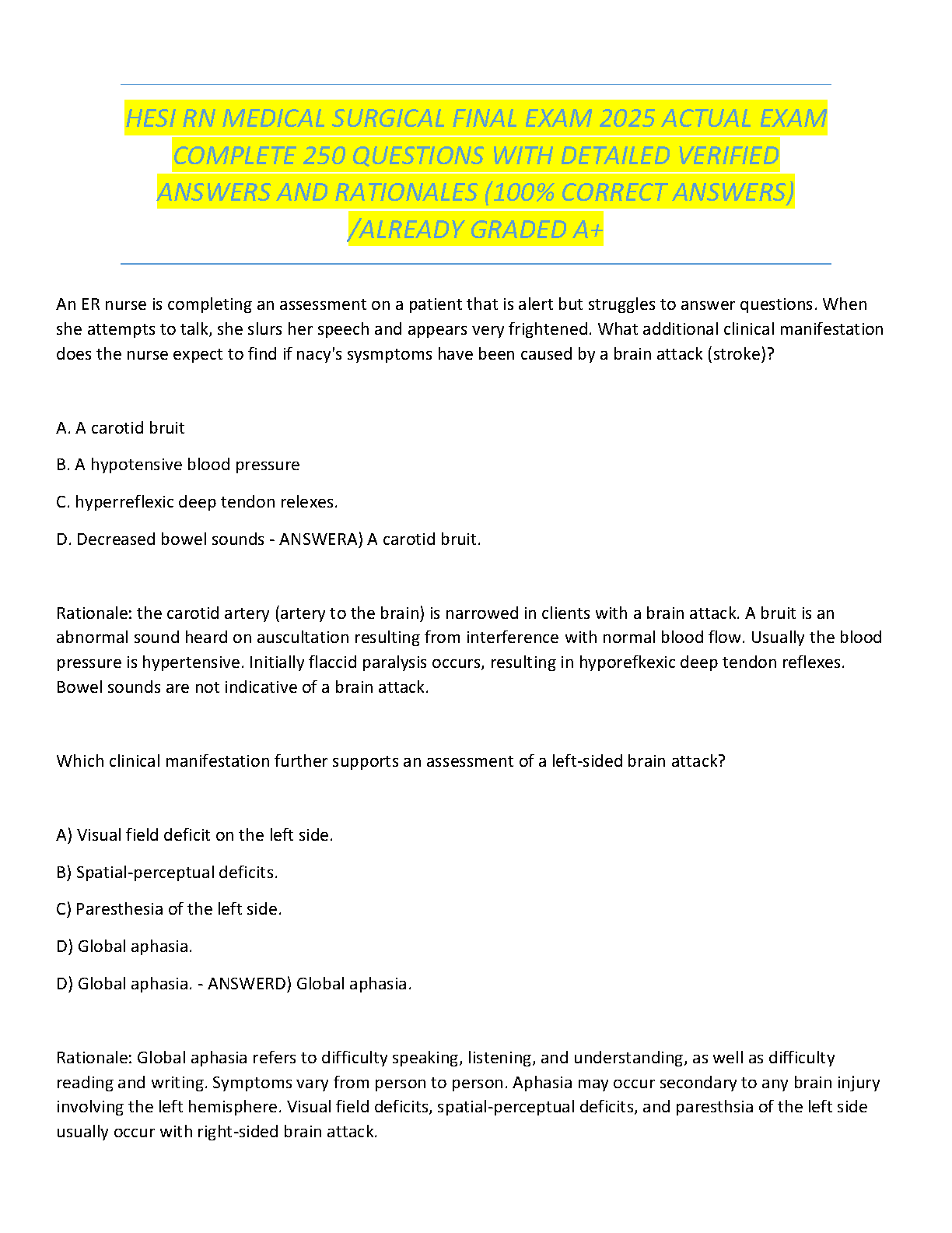 Master your HESI RN Medical-Surgical Final Exam with our comprehensive 2025/2026 study guide. This essential resource features 250 actual exam questions, each accompanied by detailed, verified answers and in-depth rationales to ensure you understand the core concepts. Already graded A+, this guide is expertly designed to help you ace your exam on the first attempt and avoid costly resits. Get the confidence you need to succeed in your nursing program with this top-rated preparation tool.