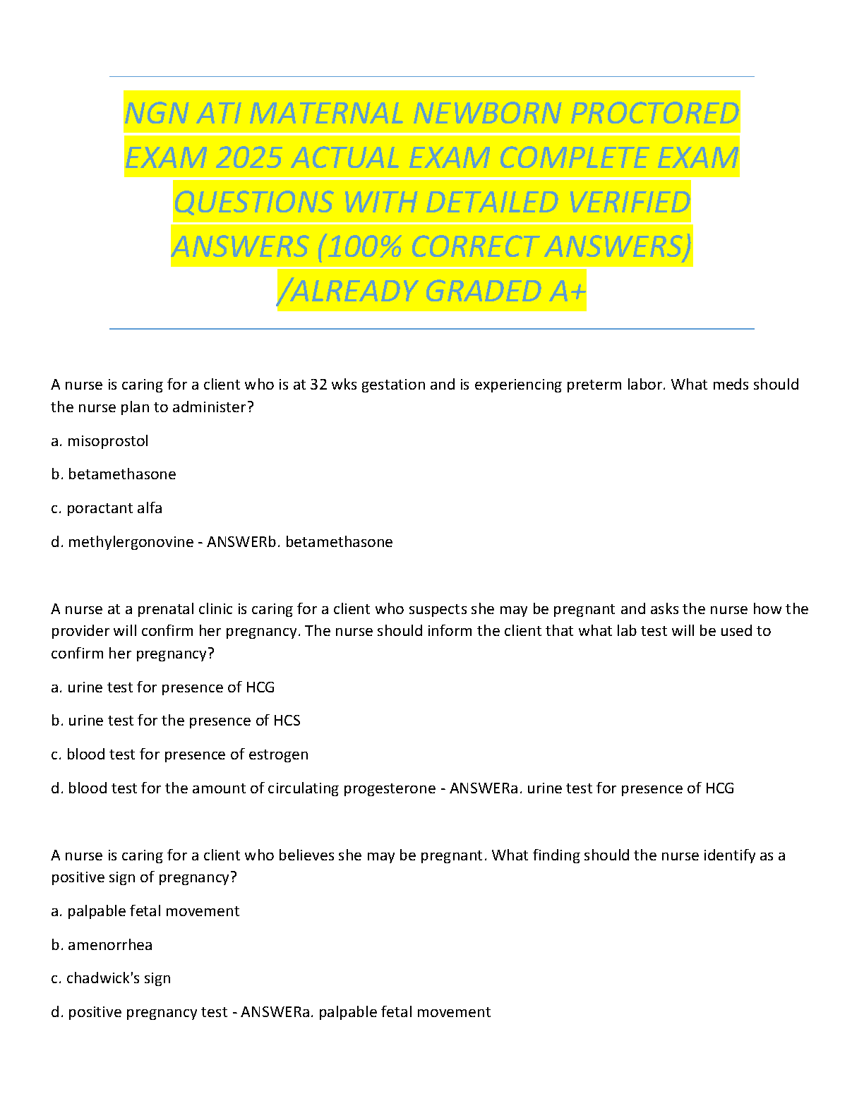 Ace your upcoming NGN ATI Maternal Newborn Proctored Exam with our comprehensive 2025 test bank. This premium study guide is expertly compiled with the latest actual exam questions and features detailed, verified answers, ensuring 100% accuracy. Designed to help you master key concepts in maternal and newborn nursing, this resource is your key to achieving an A+ grade. Prepare effectively, build confidence, and pass your exam on the first attempt, avoiding costly resits. Get immediate access to the study materials that have already helped students succeed.