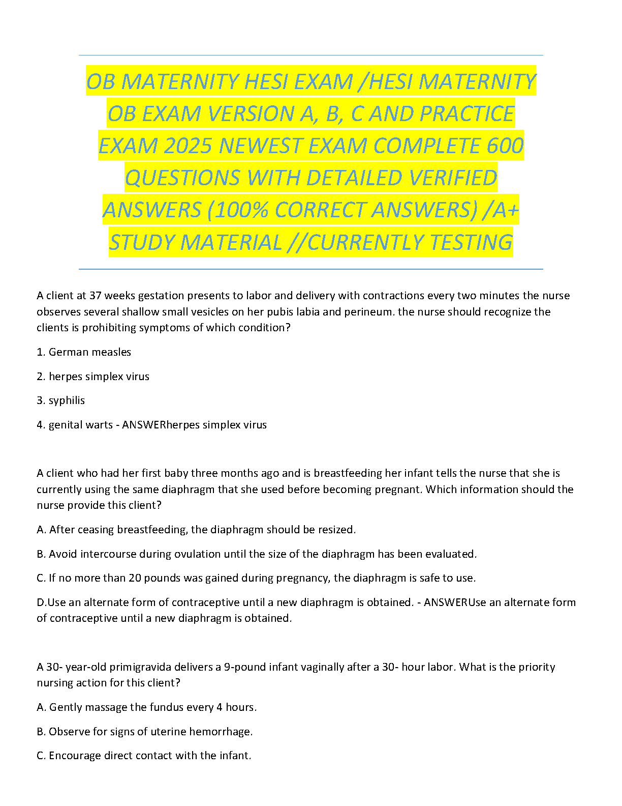 HESI OB Maternity 2025 Exam Test Bank | Versions A, B, C & Practice Exam with 600 Verified Questions and Answers