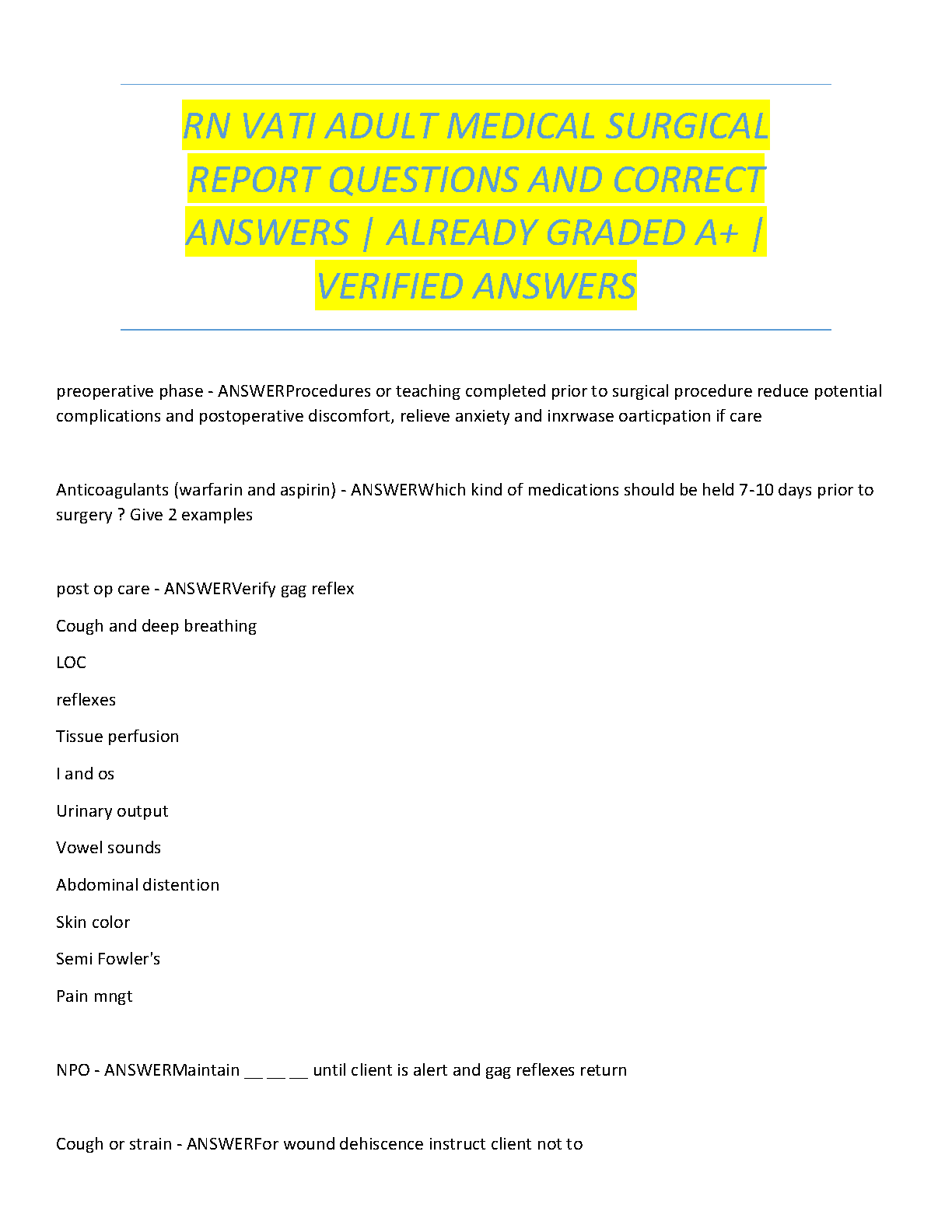 Unlock your potential and pass the RN VATI Adult Medical-Surgical exam on your first try with our expertly crafted 2025/2026 study guide. This essential resource provides a complete set of report questions paired with verified, A+ graded answers. Dive deep into key nursing concepts, including preoperative procedures, postoperative care, management of anticoagulants like warfarin and aspirin, and more. Our guide is meticulously designed to help you master the material, build confidence, and walk into your exam fully prepared for success. Avoid the stress of resits and secure your A+ with this ultimate preparation tool.