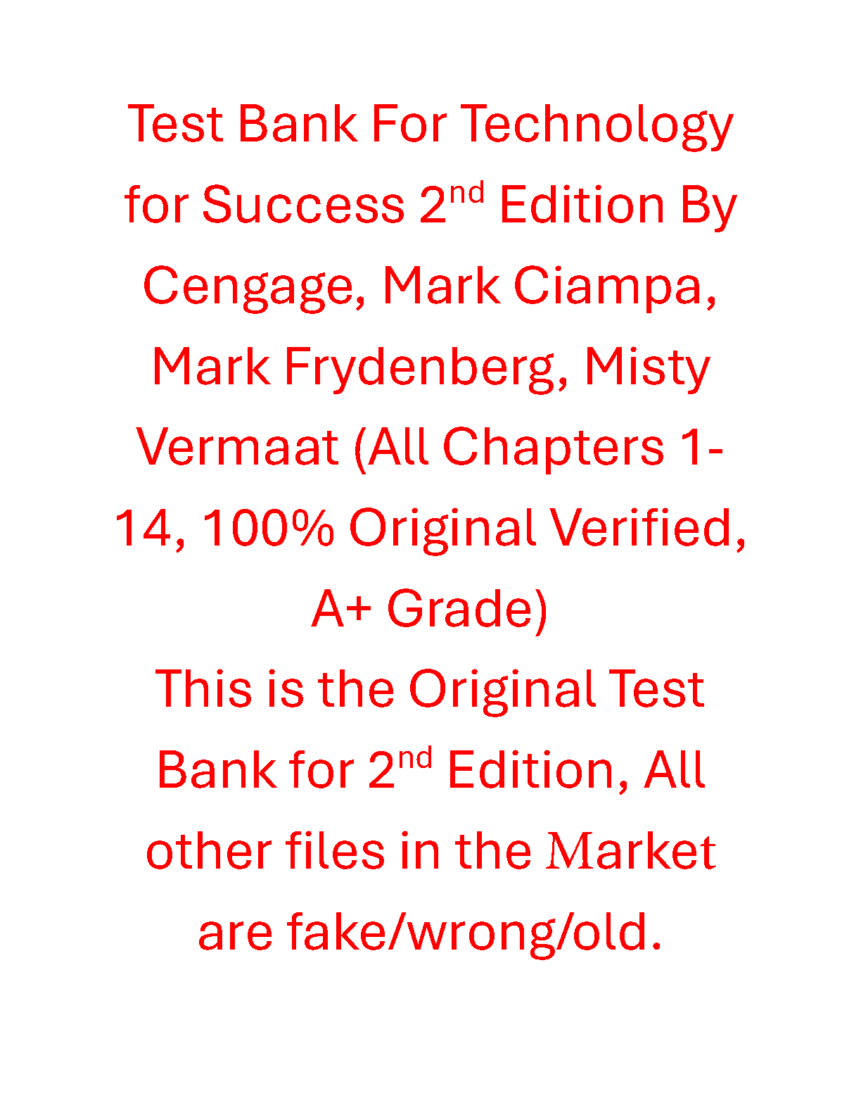 Achieve top grades in your computer concepts course with the official Test Bank for 'Technology for Success: Computer Concepts, 2nd Edition' by Ciampa, Frydenberg, and Vermaat. This comprehensive, 100% verified resource covers all chapters (1-14) and provides a vast collection of exam-style questions with answers. Master key topics, prepare effectively for exams, and gain the confidence to earn an A+. This is the authentic publisher-provided test bank, ensuring you have the most accurate and relevant material for your studies.
