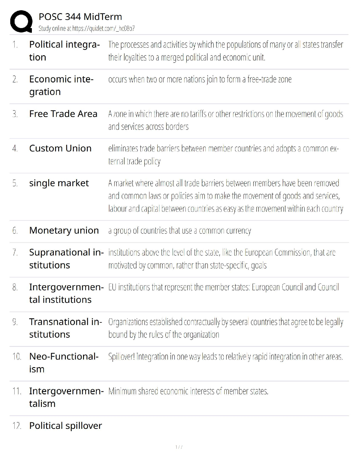 Unlock success in your POSC 344 midterm with this comprehensive exam elaboration for the 2025/2026 academic year. This essential study guide breaks down 12 fundamental concepts in political and economic integration, from Free Trade Areas and Custom Unions to complex theories like Neo-Functionalism and Intergovernmentalism. Each term is clearly defined to help you grasp the core principles of supranational and intergovernmental institutions. Stop stressing about your exam and use this targeted resource to master the material, pass on your first attempt, and avoid costly resits.