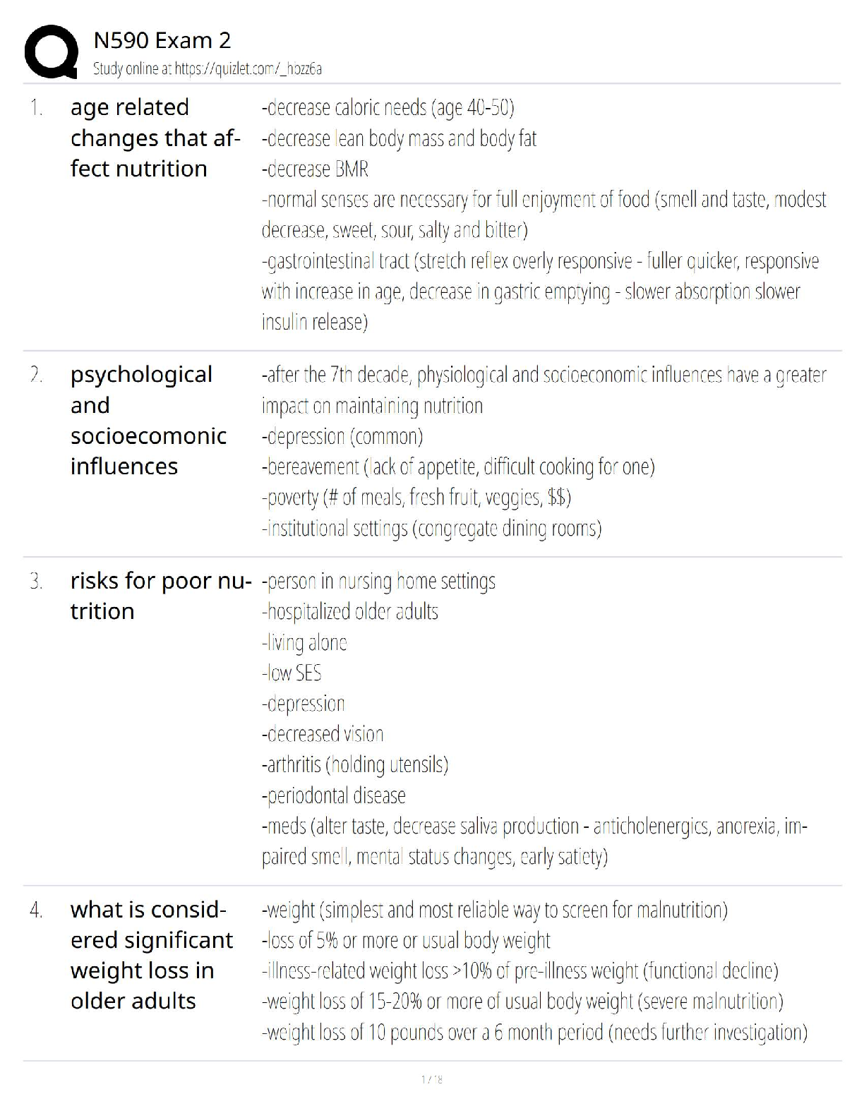 Unlock success in your N590 Exam 2 with our ultimate study guide, meticulously updated for the 2025/2026 academic year. This resource provides detailed elaborations on key geriatric health topics, including age-related nutritional changes, socioeconomic influences on diet, risks for poor nutrition, and the assessment of significant weight loss in older adults. Designed to help you study smarter, not harder, these notes will equip you with the essential knowledge needed to excel. Secure your A and pass on your first try, avoiding any need for resits!