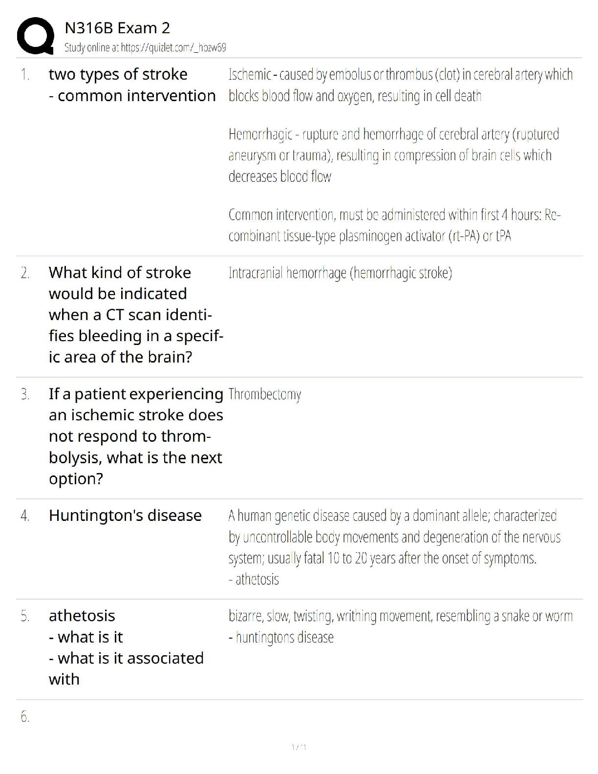 Unlock success in your N316B course with this comprehensive study guide for Exam 2, updated for the 2025/2026 academic year. This essential resource provides detailed questions and answers covering critical neurological topics. Dive deep into the two types of stroke (ischemic and hemorrhagic), understand common interventions like rt-PA and thrombectomy, and learn to identify intracranial hemorrhage on a CT scan. The guide also clarifies complex conditions such as Huntington's disease and athetosis. Designed to help you grasp key concepts quickly, this guide is your best tool to prepare effectively, avoid resits, and pass your exam on the first attempt.