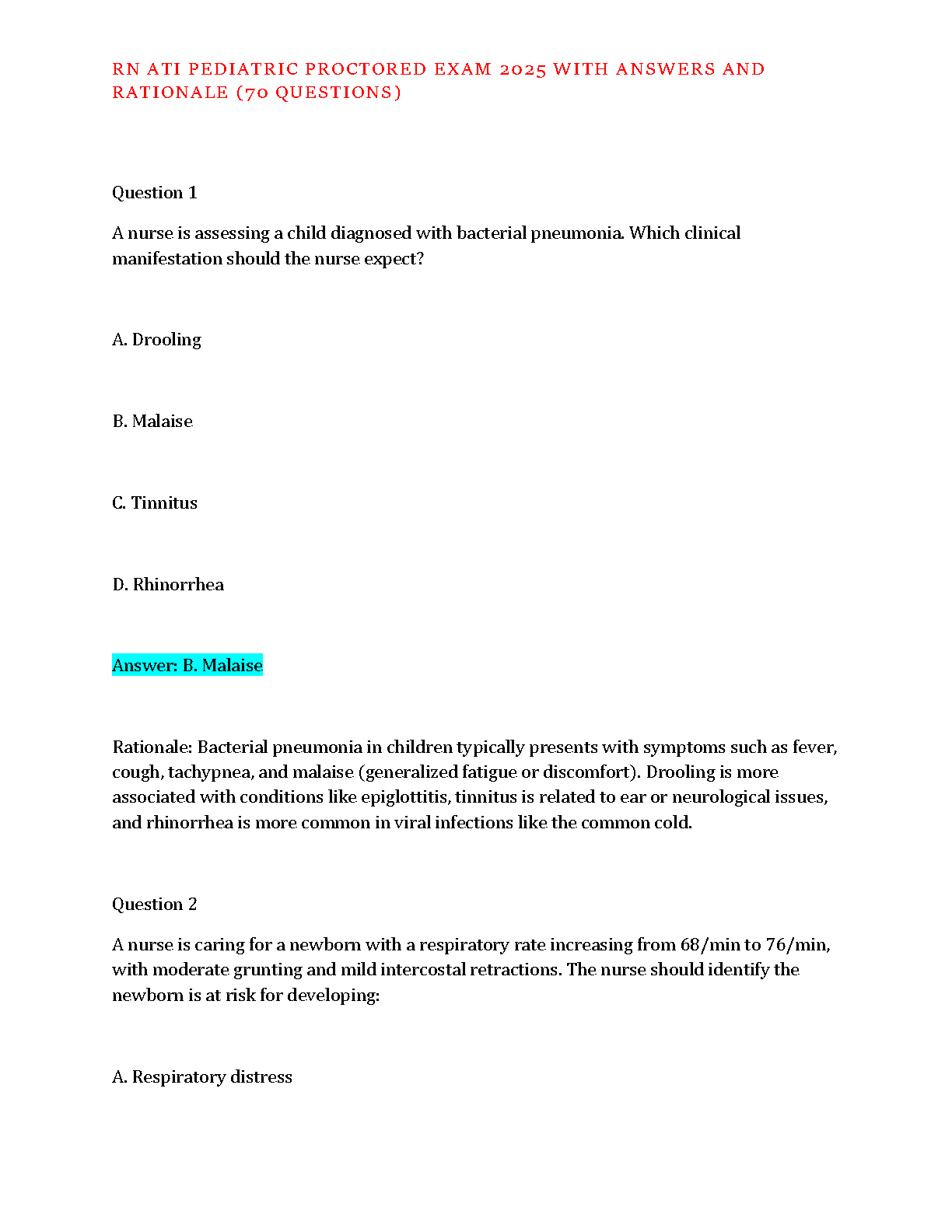 Get ready to ace your pediatric nursing exam with the latest ATI RN Pediatric Proctored Exam 2025 Test Bank. This essential study guide features a complete set of 70 practice questions, each accompanied by a correct answer and a detailed rationale. By understanding the 'why' behind each answer, you'll deepen your knowledge of critical pediatric nursing concepts. This resource is expertly designed to help you master the material, build confidence, and pass your ATI proctored exam on the first try. Download now to start your journey to success!