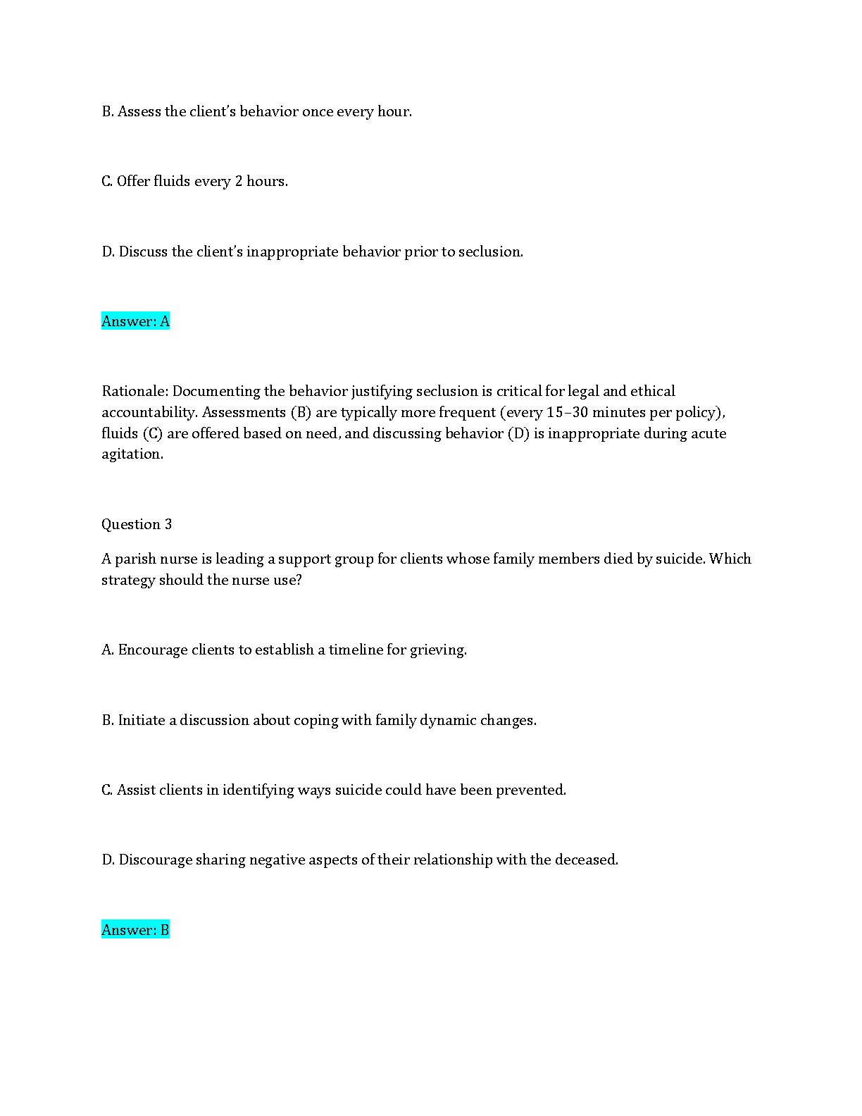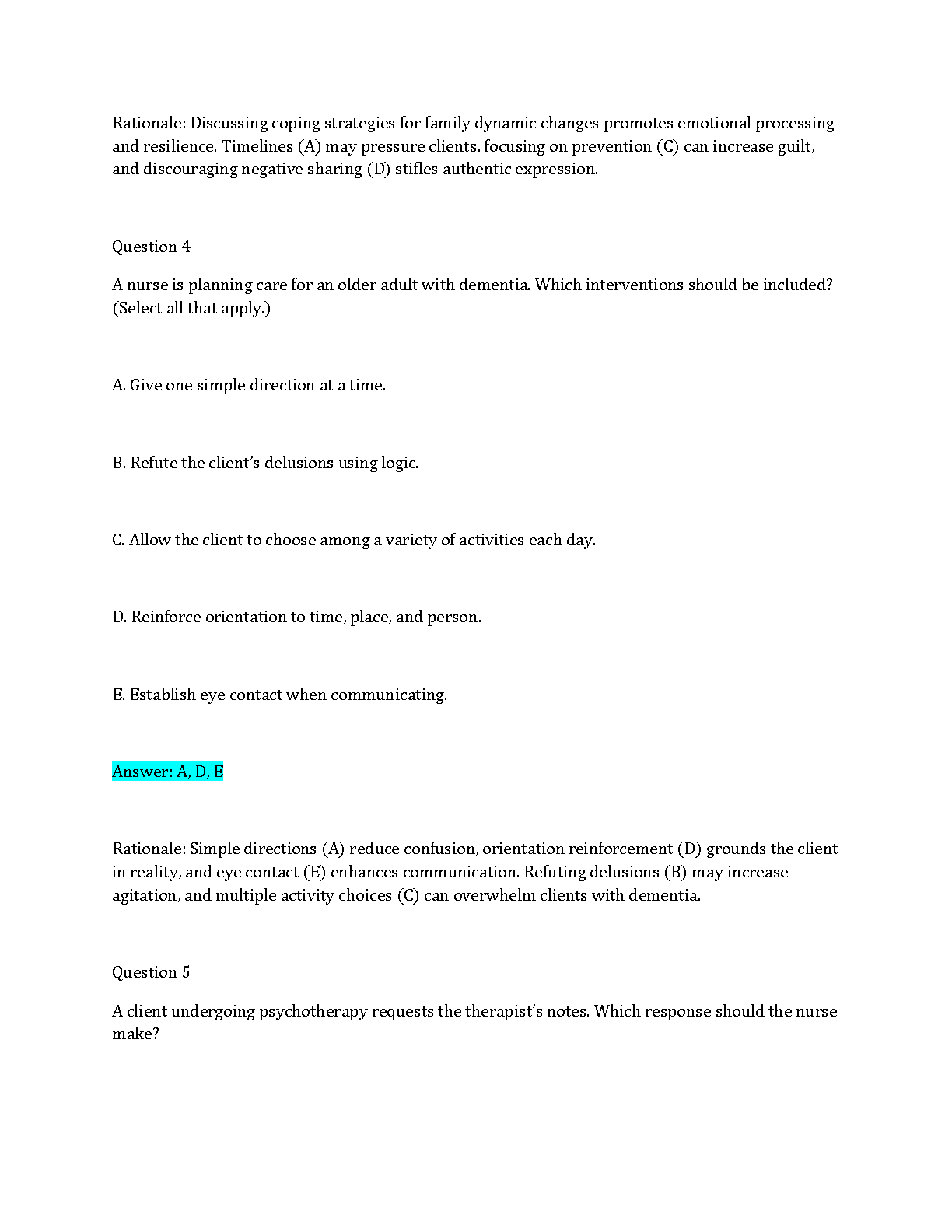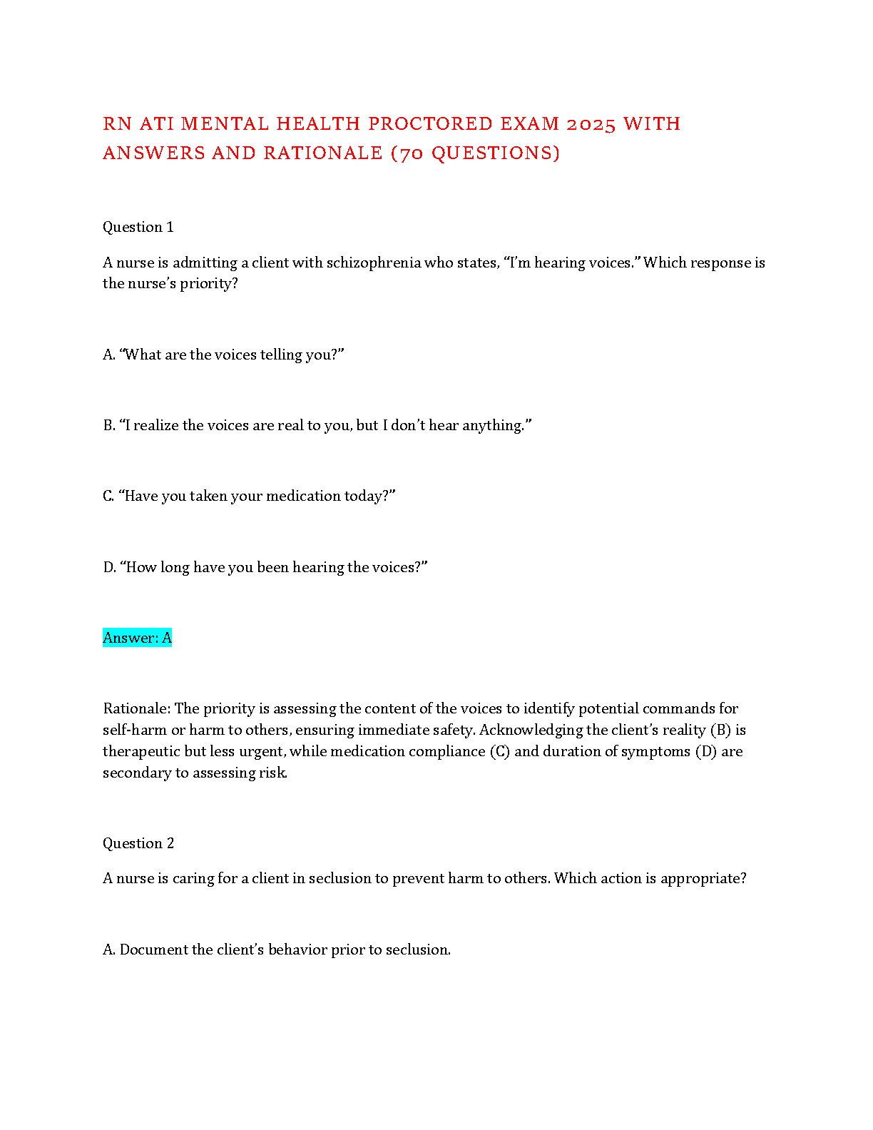 Master the RN ATI Mental Health Proctored Exam for 2025 with our premier test bank. This comprehensive study guide features 70 meticulously crafted questions, each accompanied by a verified correct answer and a detailed rationale. Designed to simulate the real exam experience, this resource helps nursing students grasp complex mental health concepts, identify areas for improvement, and build the confidence needed to excel. Prepare efficiently, understand the 'why' behind each answer, and walk into your proctored exam ready to succeed on your first attempt.