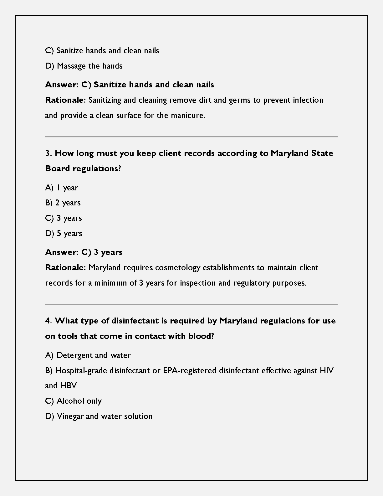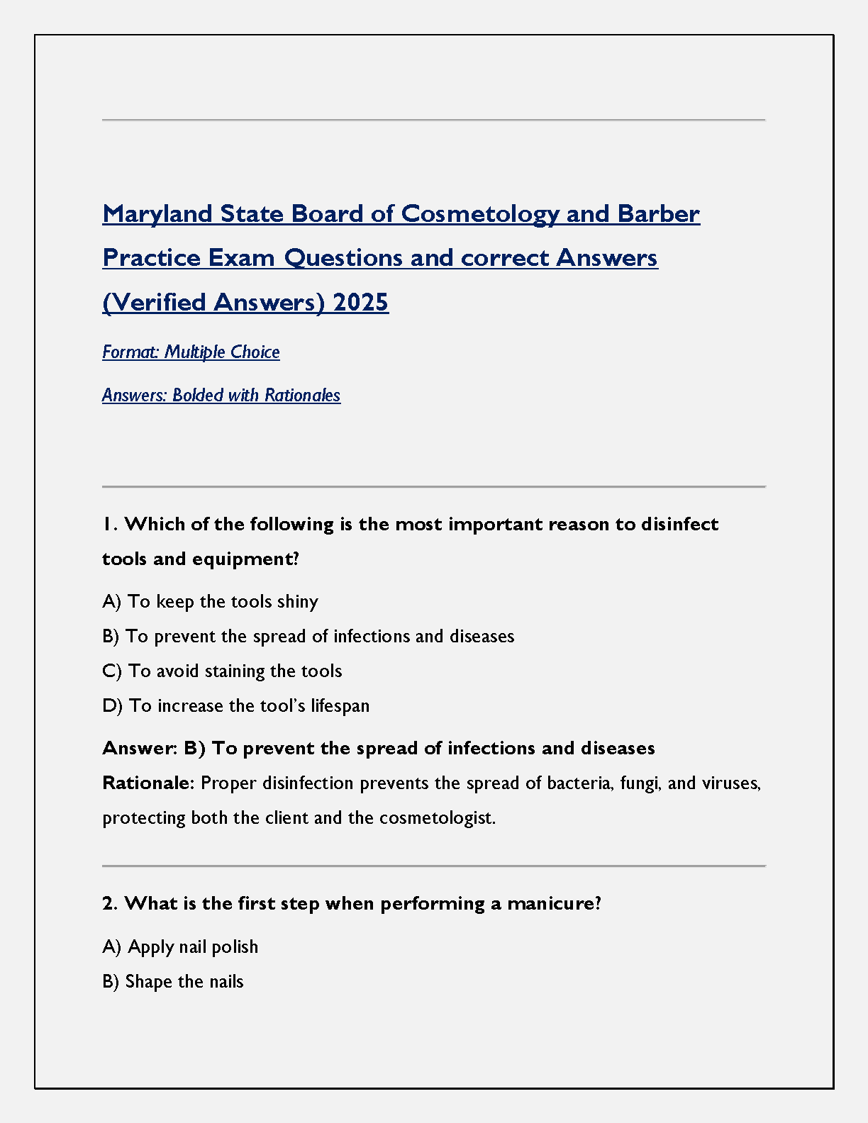 Maryland State Board of Cosmetology and Barber 2025 Test Bank: Practice Exam Questions with Verified Answers and Rationales