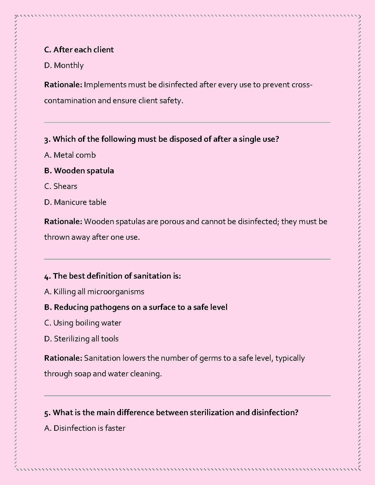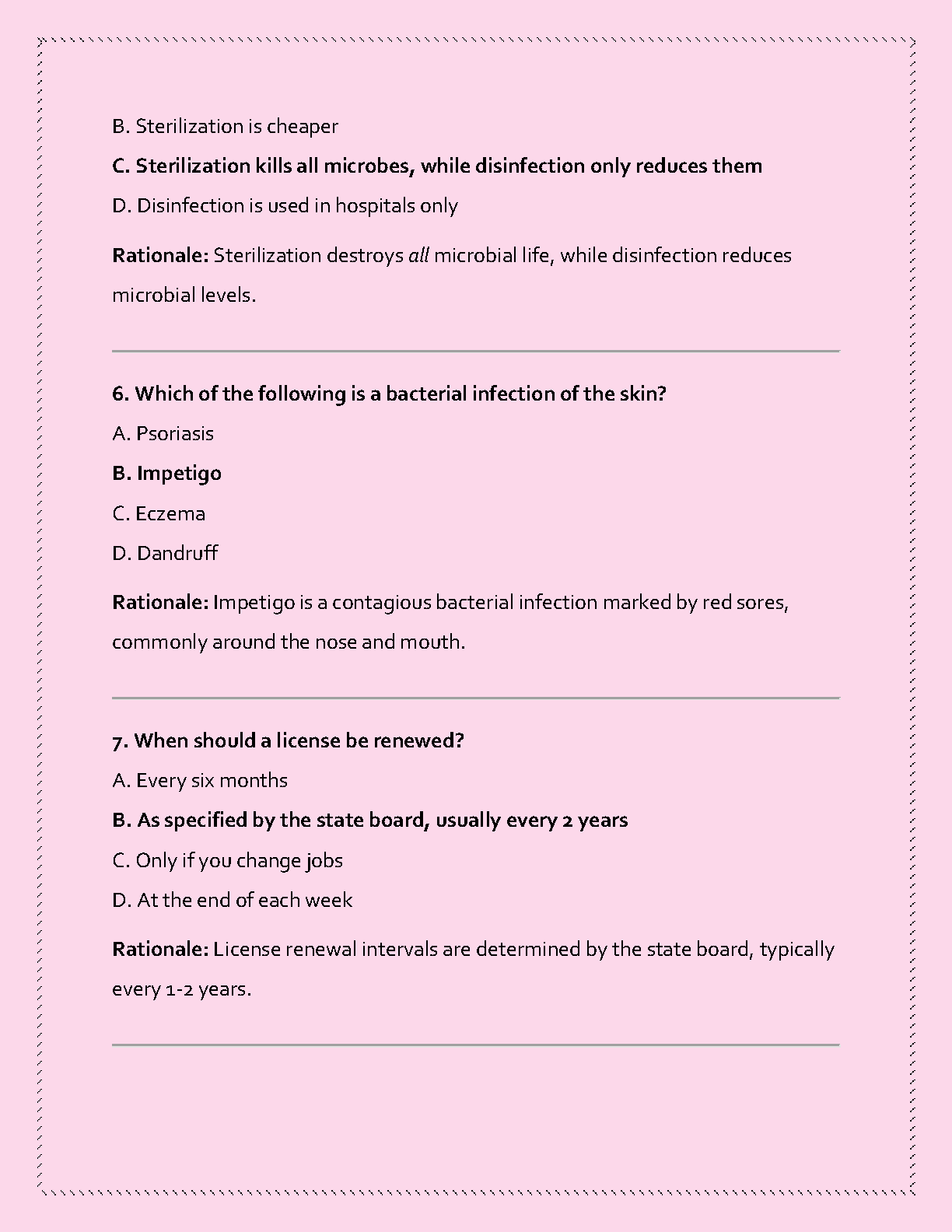 Prepare to pass your Cosmetology and Barber State Board exam with confidence! This essential study guide for the 2025/2026 testing cycle provides a comprehensive collection of practice questions designed to mirror the actual exam. Each question comes with a verified, correct answer and a detailed rationale, helping you understand the 'why' behind the rules of health, safety, and sanitation. Master the core concepts, eliminate guesswork, and walk into your exam fully prepared to succeed on your first attempt. Don't leave your certification to chance—get the ultimate practice resource today and start your career on the right foot!