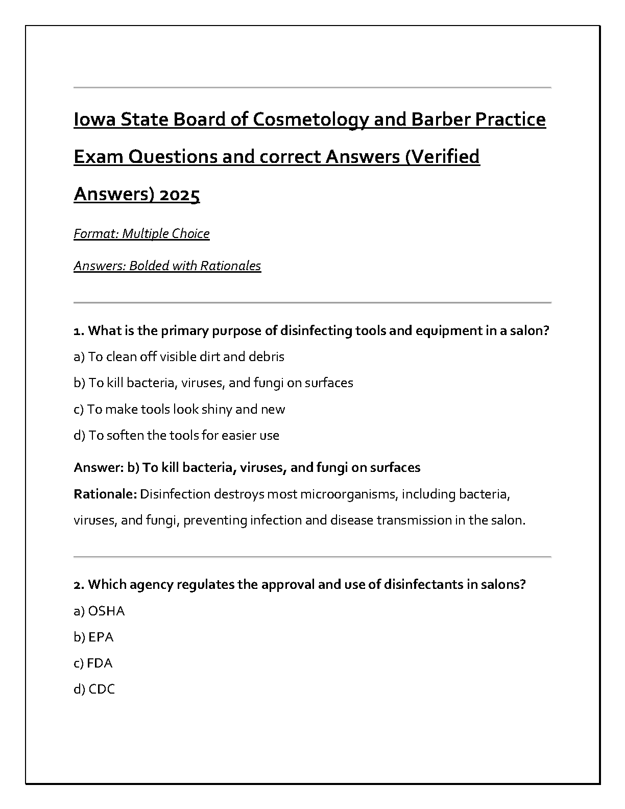 Iowa State Board of Cosmetology and Barber Practice Exam 2025: Test Bank with Verified Questions, Answers, and Rationales