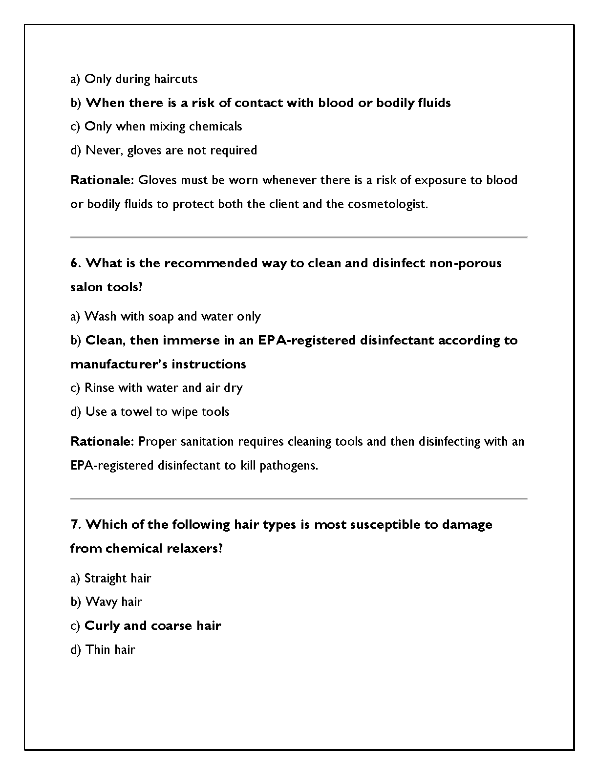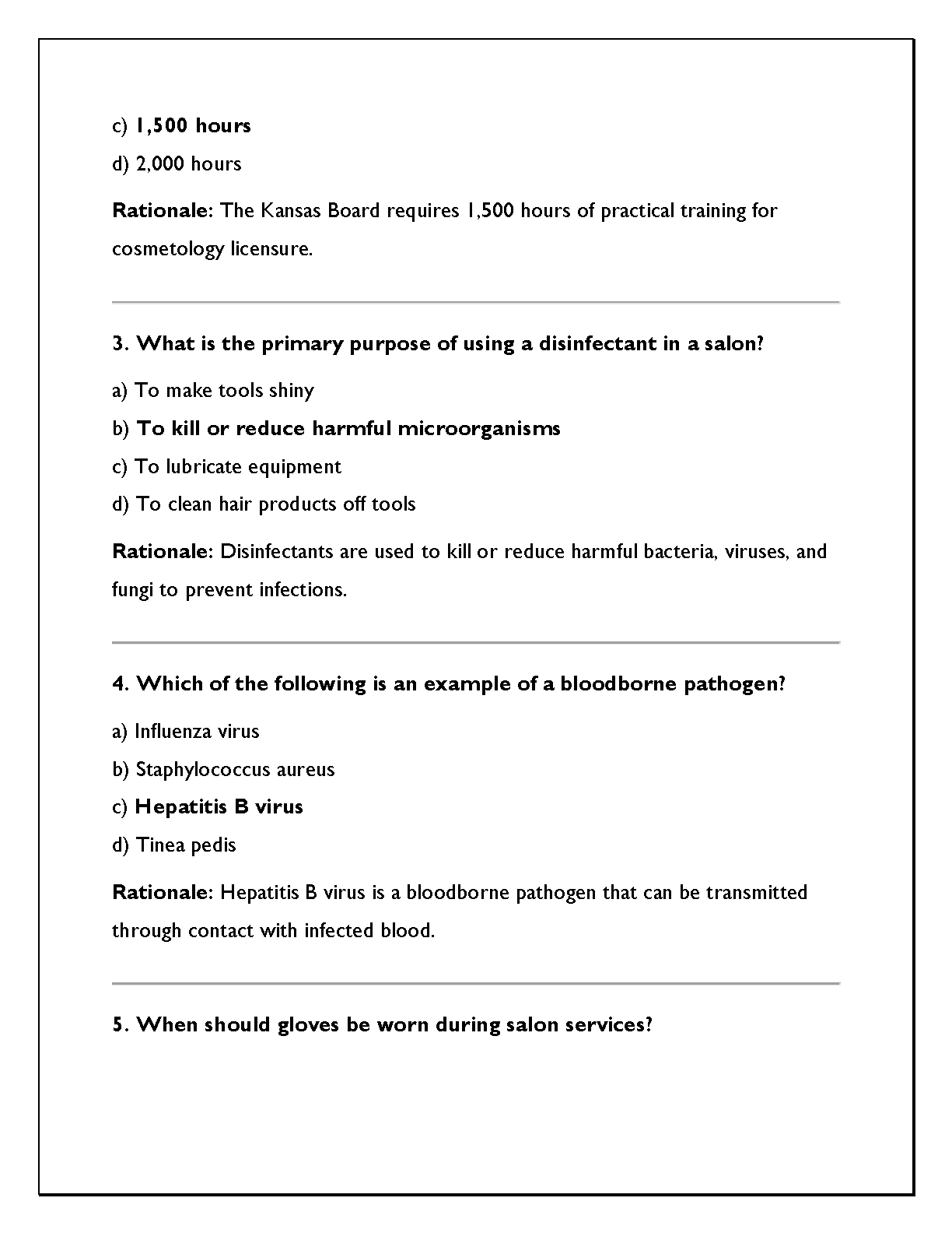 Get ready to pass the Kansas State Board of Cosmetology and Barber exam with ease! This 2025 practice exam test bank contains a comprehensive collection of questions and correct, verified answers. Each answer is followed by a clear rationale, ensuring you grasp the core knowledge required for licensure. This is the ultimate study tool for aspiring cosmetologists and barbers in Kansas aiming to succeed on their first attempt.