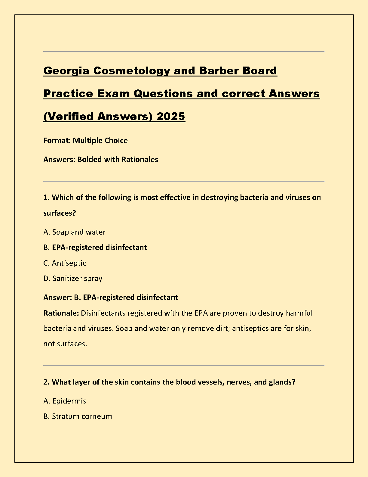 Georgia Cosmetology and Barber Board Exam Test Bank 2025: Latest Practice Questions with Verified Answers and In-Depth Rationales