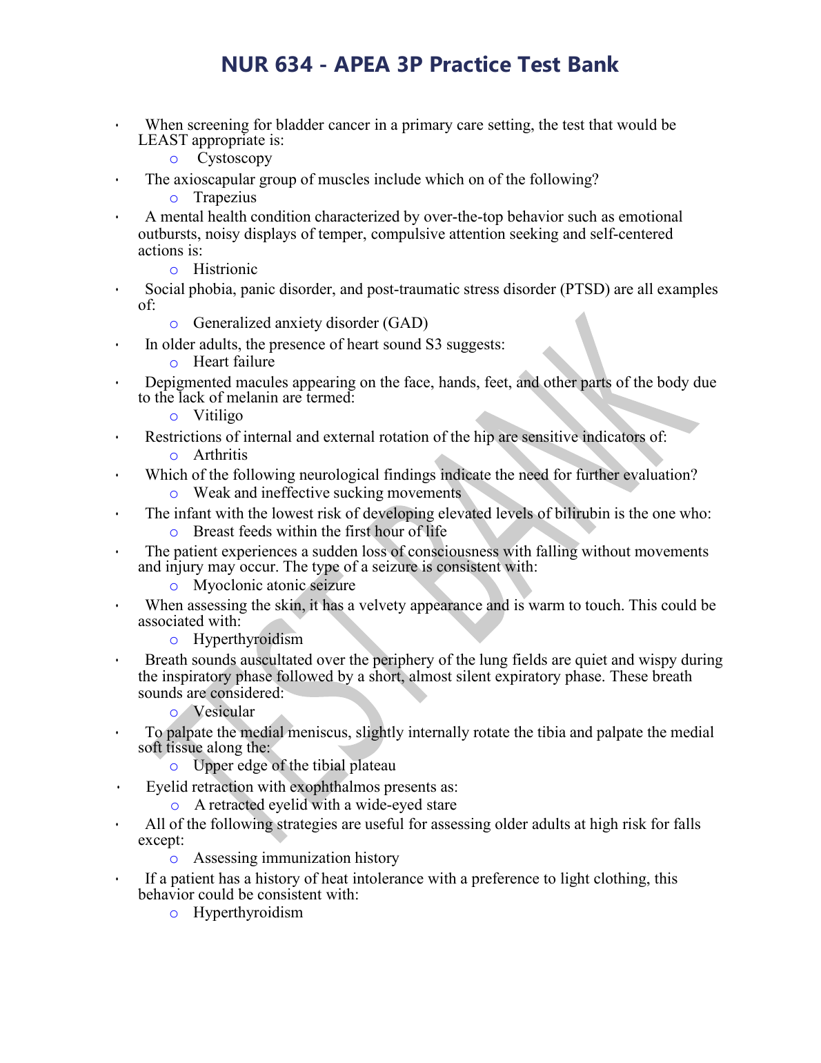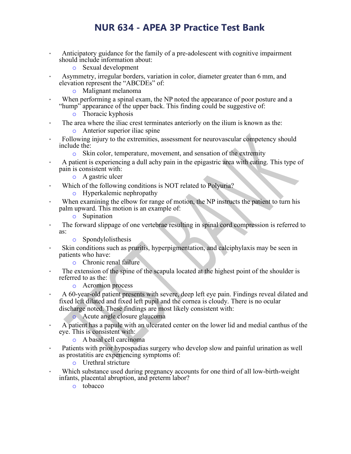 APEA 3P Test Bank 150 Questions and Correct Answers UPDATED 2022/2023 $16.00 APEA 3P Exam Prep-Dermatology Questions with Correct Answers and Explanations UPDATED 2022/2023 $16.00 APEA 3P Exam Prep- Dermatology Questions with Correct Answers and Explanations UPDATED 2022-2023 $16.00 APEA 3P Exam Prep- Sexual Health Questions with Correct Answers and Explanations UPDATED 2022/2023 $16.00 APEA 3P exam Questions UPDATED 2022-2023 $16.00 APEA 3P Practice Questions UPDATED 2023 $16.00 NR 509 APEA 3P Exam Week UPDATED 2023 $16.00 NSG 6001 APEA 3P Exam UPDATED 2022/2023 $16.00 APEA 3P Exam PrepNephrology/GU Questions with Correct Answers and Explanations UPDATED 2022/2023 $16.00 APEA 3P Exam UPDATED 2022/2023 $16.00 APEA 3P Exam | 75 All Correct Questions & Answers latest version 2022/2023 $16.00 NSG 6020 - APEA 3P Final Exam 2022 - UPDATED Questions And Answers $16.00 NR 509 APEA 3P Exam Week 8 WITH CORRECT ANSWERS UPDATED 2023 $16.00 NUR 634 - APEA 3P Practice Test Bank Questions and Answers UPDATED 2023 $16.00 GRAND CANYON UNIVERSITY NURSING NUR 634 APEA 3P EXAM QUESTIONS AND ANSWERS 100% CORRECT APEA 3P PRACTICE QUESTIONS UPDATED $16.00 APEA 3p Final Exam Questions and Answers UPDATED 2023 $16.00 NR 509 APEA 3P Exam Week 8 QUESTIONS AND ANSWERS UPDATED 2022/2023 $16.00 ALL APEA EXAM PACKAGE QUESTIONS WITH VERIFIED ANSWERS TEST BANK 2023 $18.00 NSG 6020 - APEA 3P Final Exam 2022 – Complete Set (530Questions with all Correct Answers) UPDATED $18.00 NUR 634 - APEA 3P Practice Test Bank UPDATED 2023 $16.00 APEA 3p Updated Answers for FINALEXAM 2022 $16.00 APEA 3P Exam Prep - Health Promotion Questions with Correct Answers and Explanations $18.00 APEA 3P Exam Prep- GI Questions with Correct Answers and Explanations UPDATED 2023 $18.00 APEA 3P Exam Prep- Women's Health Questions with Correct and Explanations UPDATED 2023 $18.00 APEA 3P EXAM PREP-PROFESSIONAL ISSUES ETHICS QUESTIONS AND ANSWERS WITH EXPLANATIONS UPDATED 2023 $18.00 APEA 3P EXAM Questions & Answers UPDATED 2023 $18.00 APEA 3P EXAM QUESTIONS AND ANSWERS UPDATED 2023 $18.00 APEA 3P EXAM REVIEW WEEK 2 NURSING 6023 UPDATED 2023 $18.00 NSG 6001 APEA 3P Exam / NSG6001 APEA 3P’s Exam UPDATED 2023 $18.00 NSG 6420 APEA 3P EXAM 157 QUESTIONS WITH CORRECT AND VERIFIED ANSWERS(LATEST 2023) $18.00