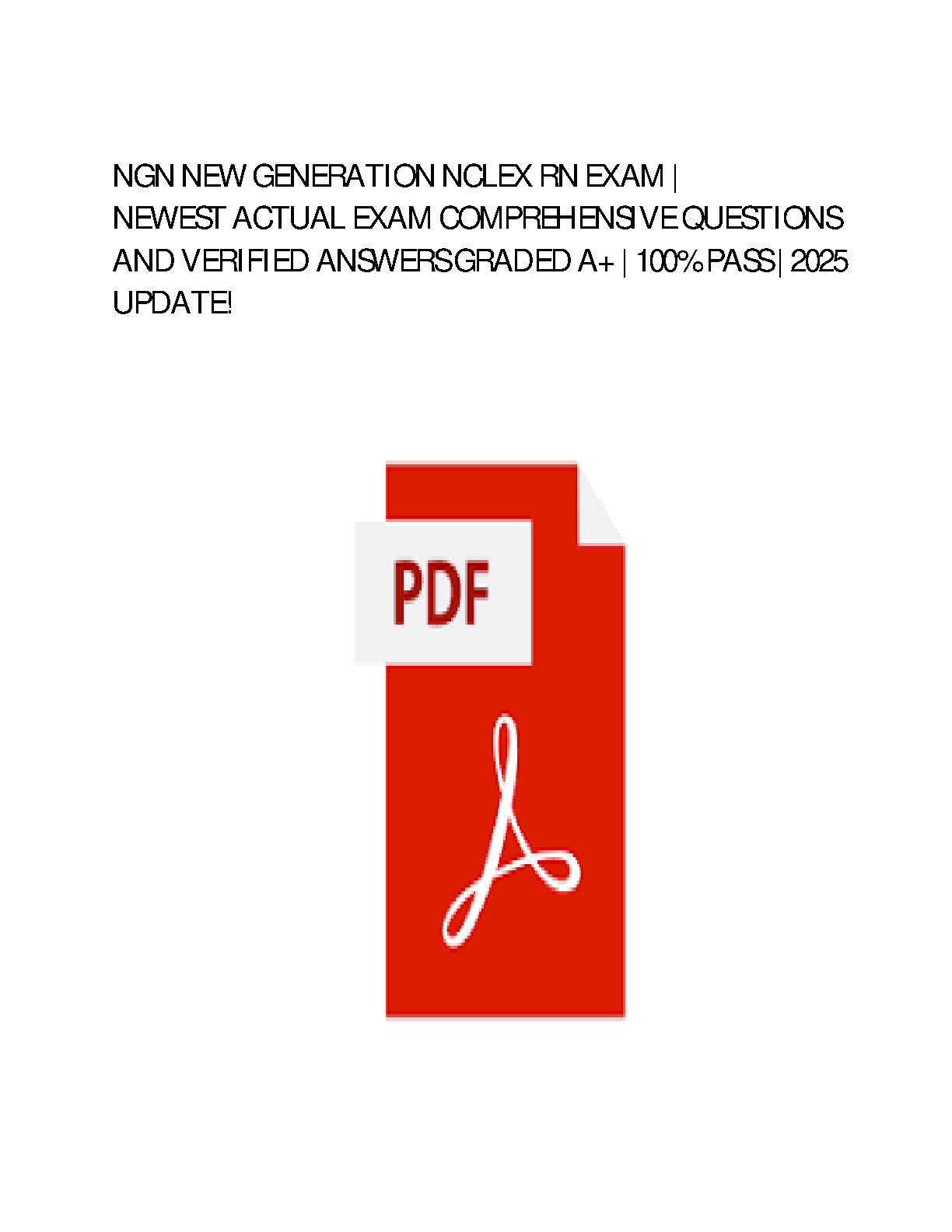 Prepare to excel on your first try with our definitive 2025 NGN NCLEX-RN Exam Test Bank. This comprehensive resource is packed with the newest actual exam questions and meticulously verified answers, all designed to secure you an A+ grade. Updated for the latest 2025 syllabus, this guide covers all critical areas of the Next Generation NCLEX, ensuring you have the knowledge and confidence to achieve a 100% pass rate. Stop stressing and start studying smart with our proven exam preparation materials.