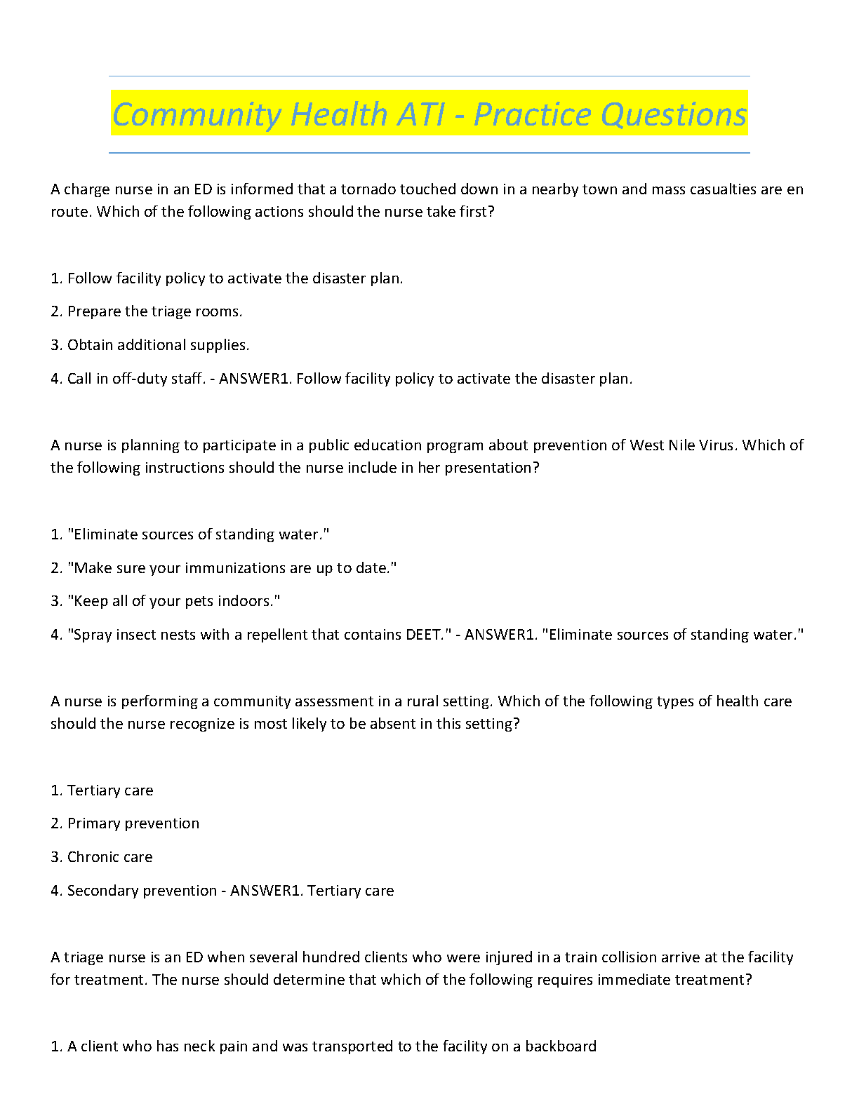 Ace your ATI RN Community Health Nursing exam with this comprehensive test bank for the 11th Edition. This essential study guide, fully updated for the 2025/2026 academic year, is designed to help you master critical concepts and pass on your first attempt. This resource features a wide array of practice questions with verified answers, covering key topics such as disaster preparedness, public health education, triage, and community assessments. Avoid the stress of resits and study effectively with these targeted questions designed to mirror the actual ATI proctored exam.