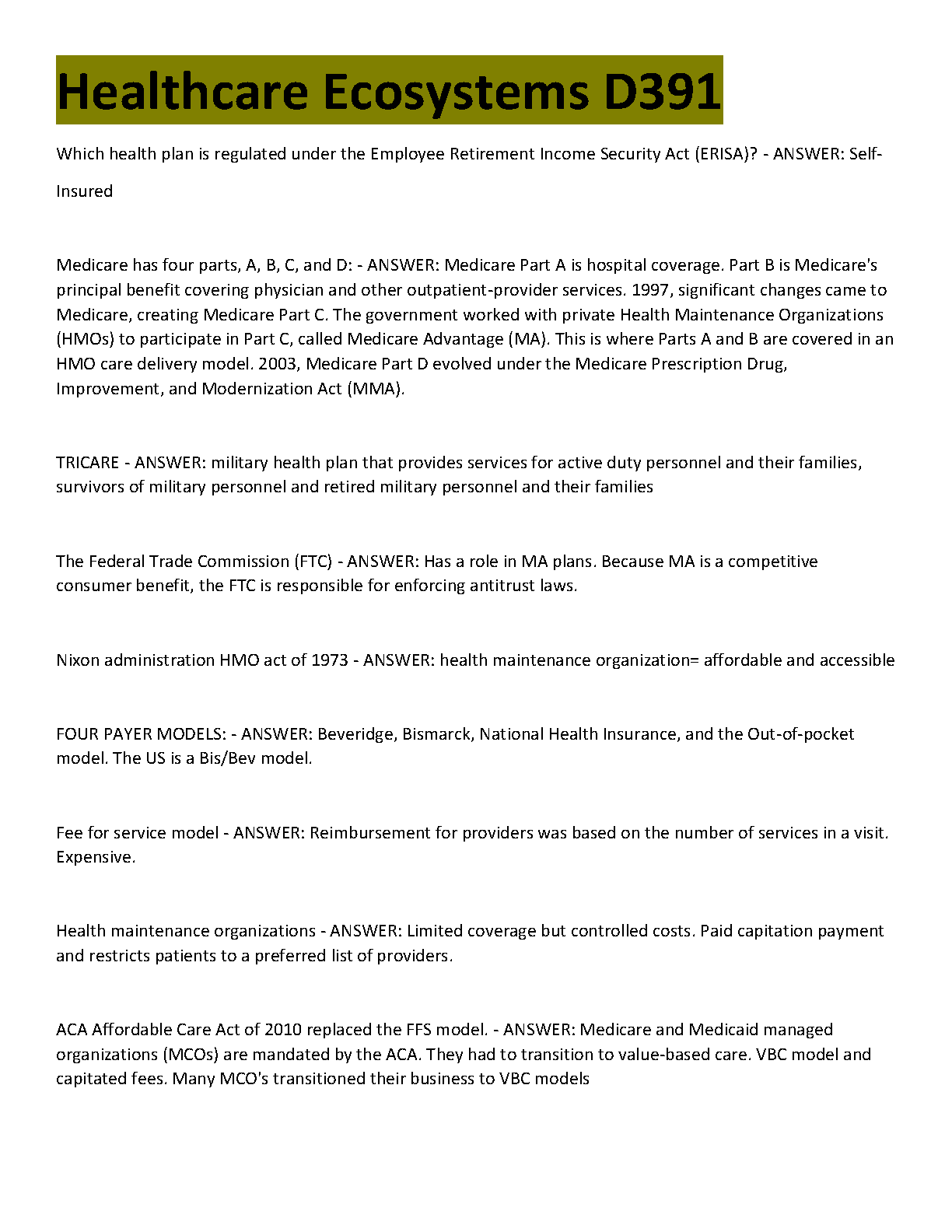 Ace your WGU D391 Healthcare Ecosystems course with our latest 2025/2026 exam study guide. This comprehensive resource provides detailed answers and explanations to crucial topics, including the intricacies of Medicare (Parts A, B, C, D), TRICARE, the Affordable Care Act (ACA), various payer models like Beveridge and Bismarck, and the role of HMOs. Structured in a clear Q&A format, this guide is your key to mastering the curriculum and passing your exams on the very first attempt. Avoid resits and build a solid foundation in healthcare systems with this essential study aid.