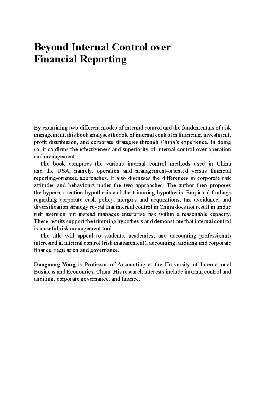 Struggling with complex financial control concepts? Master them and guarantee exam success with this essential 2025/2026 study resource. This guide, based on Daoguang Yang's groundbreaking 'Beyond Internal Control Over Financial Reporting,' offers a strategic perspective that goes beyond standard ICFR and the COSO framework. Explore a more comprehensive and powerful internal control model through the lens of the Chinese experience. The detailed analysis and case studies provide practical insights crucial for excelling in corporate governance, strategic management, and accounting courses. This updated resource is tailored to help you understand difficult topics, pass your exams on the first attempt, and avoid costly resits.