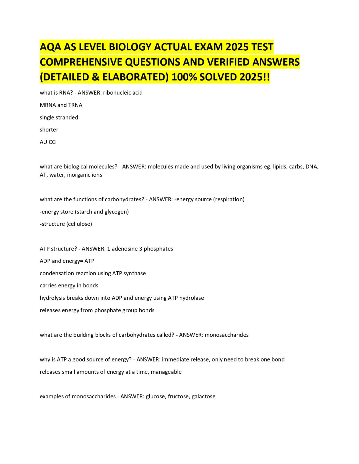 Ace your AQA AS Level Biology exams with our newly released resource for the 2025/2026 academic year. This comprehensive guide is packed with actual exam-style questions and 100% verified, detailed answers. Covering essential topics such as biological molecules, RNA, carbohydrates, and ATP, this material is expertly crafted to help you master the subject. Avoid the stress of resits and walk into your exam with confidence. This is the ultimate study tool to help you pass on your first attempt and achieve top marks.