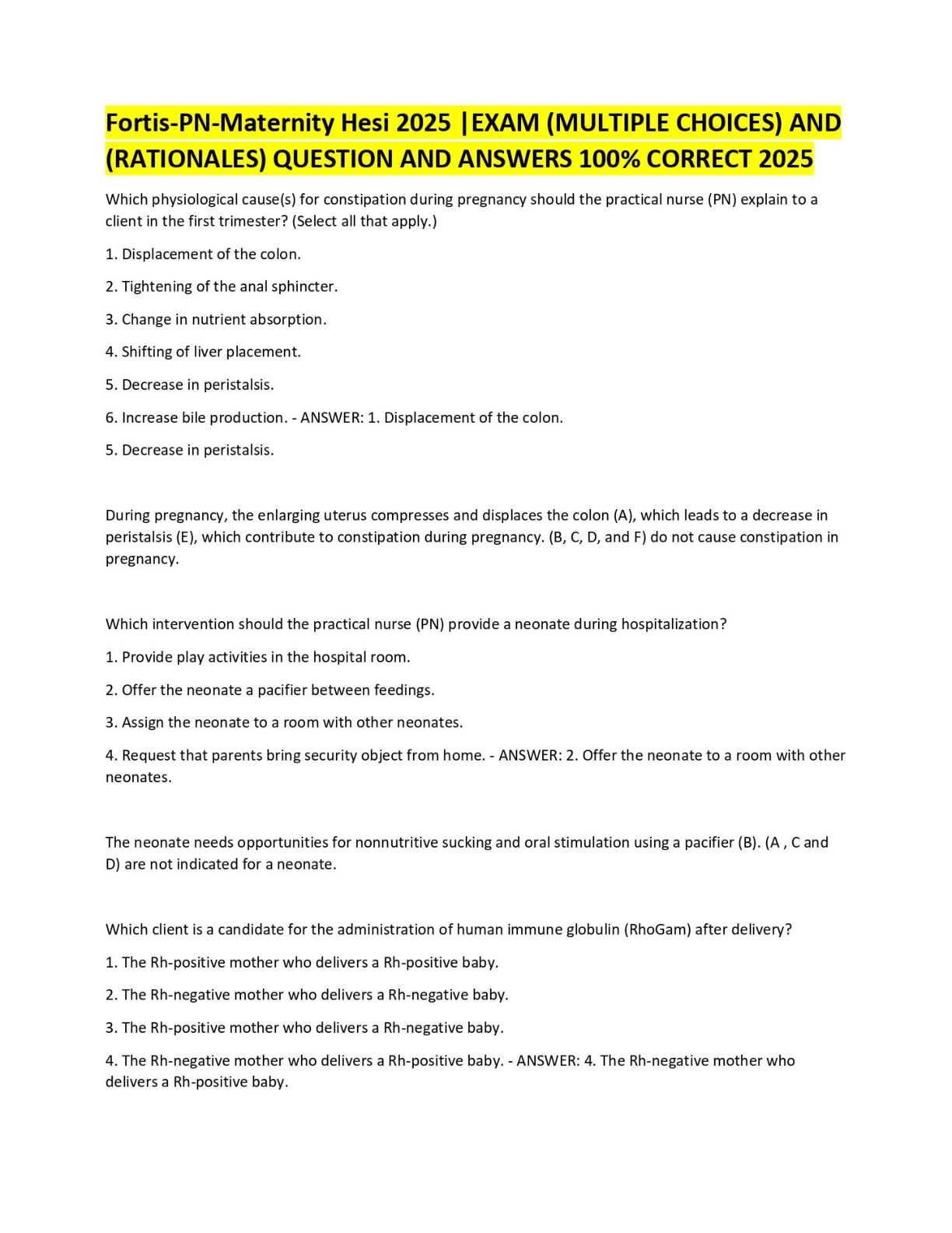 Ace your PN Maternity HESI exam with this comprehensive 2025 study guide. This essential resource features a complete set of multiple-choice questions, 100% correct answers, and detailed rationales for every question. Designed for the 2025-2026 academic year, this guide helps you understand key maternity nursing concepts, master the HESI format, and boost your confidence. Prepare effectively, avoid resits, and pass your Fortis-PN-Maternity Hesi exam on the first attempt with these verified practice questions.