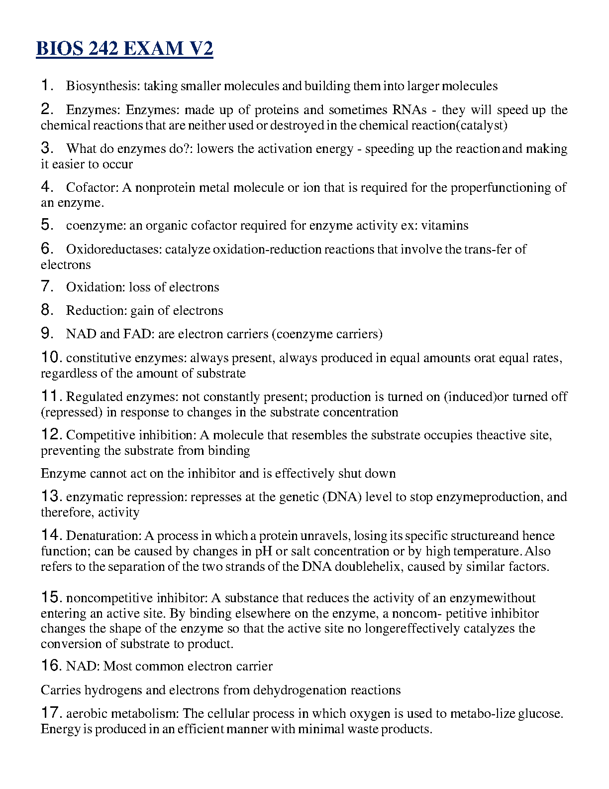 Unlock your full potential in BIOS 242 with our comprehensive Exam 2 (V2) elaboration, fully updated for the 2025/2026 academic year. This essential study guide breaks down complex topics into easy-to-understand definitions, covering everything from biosynthesis and enzyme kinetics to competitive inhibition and aerobic metabolism. Master key concepts like NAD, FAD, cofactors, and denaturation to ensure you're prepared. This resource is expertly designed to help you grasp the core material, pass your exam on the first attempt, and avoid costly resits. Get the grade you deserve!