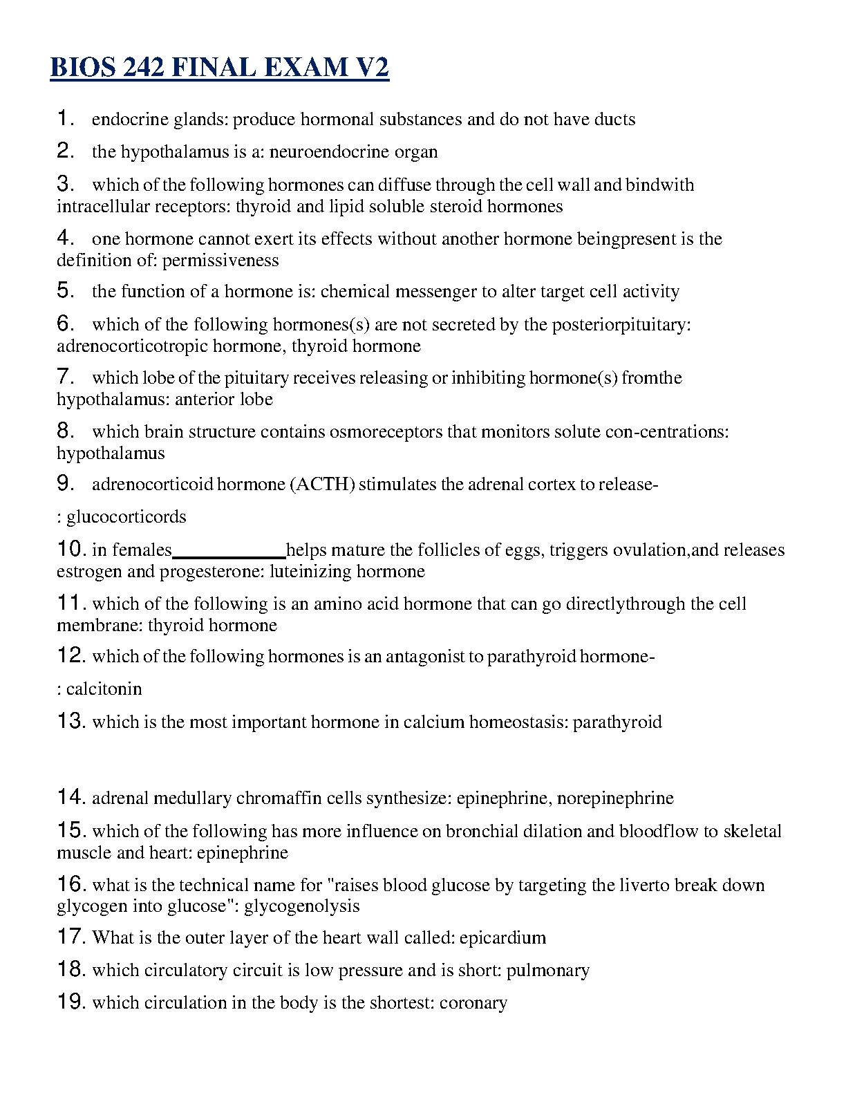 Ace your BIOS 242 Final Exam with this comprehensive and up-to-date test bank for the 2025/2026 academic year. This resource, Version 2, is meticulously designed for students of Human Anatomy and Physiology II. It features a detailed collection of final exam questions complete with verified answers. Key topics covered include the endocrine system, hormonal functions, the cardiovascular system, and circulatory pathways. This study guide is your ultimate tool to understand complex concepts, practice for your exam, and achieve top grades. Pass your BIOS 242 final on the first try with this essential study aid.