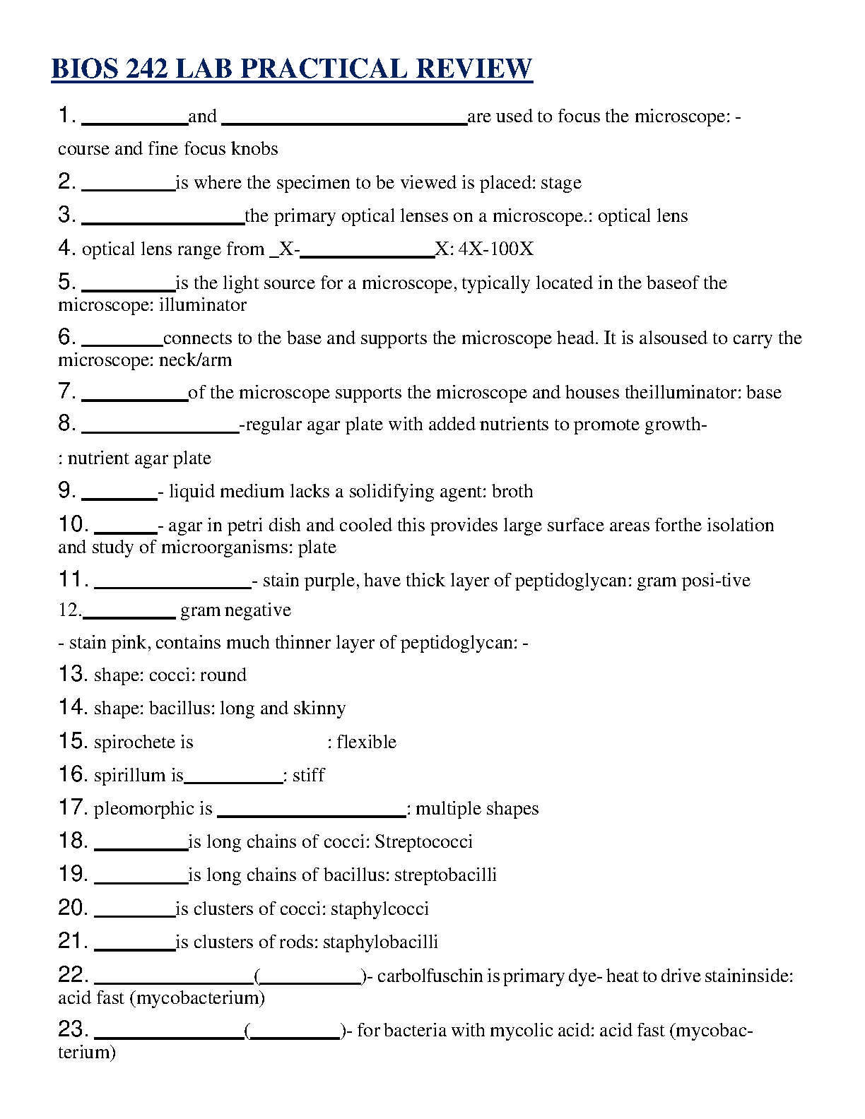 Struggling with your BIOS 242 Lab Practical? This comprehensive study guide for the 2025/2026 academic year is your ultimate tool for success. Based on the core concepts from 'Microbiology: An Introduction, 14th Edition' by Gerard J. Tortora, Berdell R. Funke, and Christine L. Case, this review sheet covers all essential topics you need to know. Master the parts of the microscope, differentiate between culture media, and confidently identify bacteria using Gram stain and acid-fast techniques. With clear questions and direct answers on bacterial shapes and arrangements, you can test your knowledge and be fully prepared. Download now to ace your practical exam on the first attempt and avoid resits!