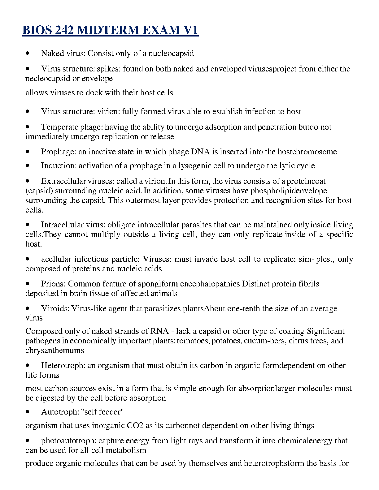 Unlock success in your BIOS 242 midterm with this comprehensive V1 exam study guide, fully updated for the 2025/2026 academic year. This essential resource provides detailed definitions and elaborations on critical microbiology topics including naked viruses, prions, viroids, temperate phages, and cellular metabolism (heterotrophs vs. autotrophs). Perfectly aligned with the key concepts from 'Microbiology: A Systems Approach, 6th Edition' by Cowan and Smith, this guide is meticulously designed to help you ace your exam on the first try and avoid any resits.