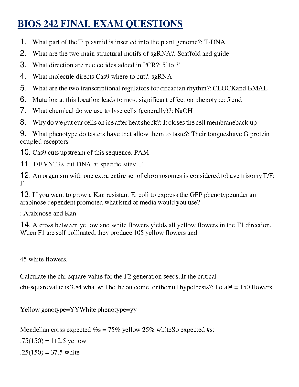 Master your BIOS 242 final exam with this comprehensive study guide, fully updated for the 2025/2026 academic year. This resource provides a targeted list of final exam questions complete with accurate, verified answers, covering essential topics in genetics. Dive into key concepts such as DNA technology (Ti plasmid, PCR, CRISPR/Cas9), gene regulation, Mendelian inheritance, and chi-square analysis. Designed to streamline your study process, this guide is your ultimate tool to build confidence, understand complex topics, and pass your exam on the first attempt, helping you avoid costly and stressful resits.