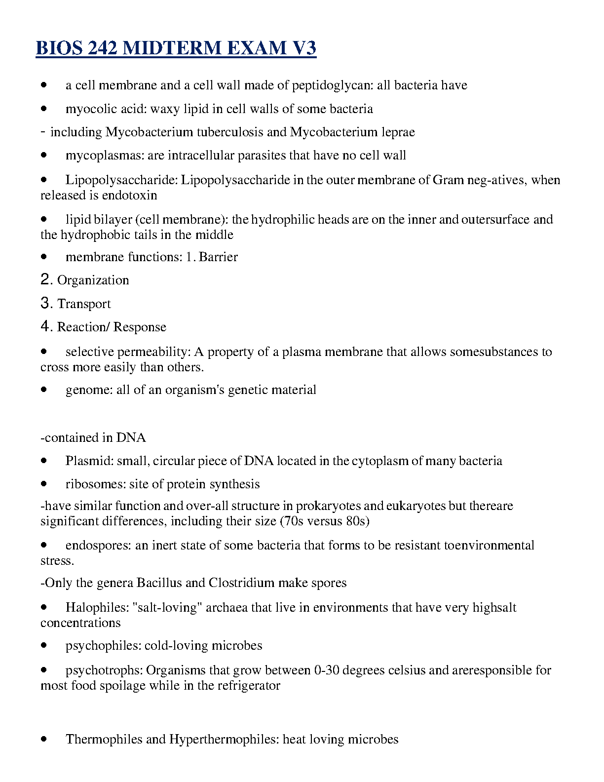 Unlock exam success with our meticulously crafted study guide for the BIOS 242 Midterm Exam (V3), tailored for the 2025/2026 academic year. This essential resource provides in-depth notes on critical microbiology concepts, including bacterial cell wall structures (peptidoglycan, mycolic acid), lipopolysaccharides, membrane functions, and genetic components like plasmids and ribosomes. It also covers key classifications of microbes such as psychrophiles, thermophiles, and halophiles. Aligned with the core curriculum from leading textbooks like Tortora's 'Microbiology: An Introduction,' this guide is designed to simplify complex topics and provide the clarity you need to excel. Stop stressing and start studying smart to pass your midterm on the very first attempt!