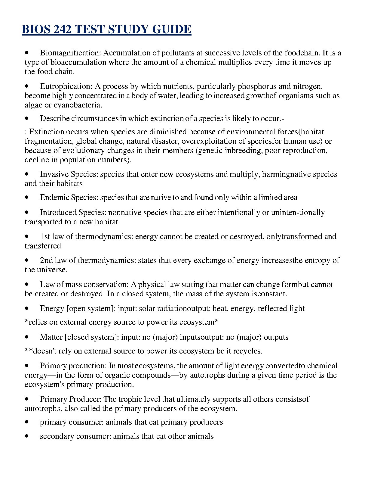 Struggling with BIOS 242? Master the essentials of Ecology with our latest and most comprehensive study guide for the 2025/2026 academic year! This in-depth resource breaks down complex topics into easy-to-understand definitions and explanations. Gain a solid understanding of key concepts such as biomagnification, eutrophication, the laws of thermodynamics in ecosystems, trophic levels, and the dynamics of invasive vs. endemic species. Designed specifically to help you excel in your exams, this study guide provides the focused knowledge you need to pass on your first attempt. Stop cramming and start understanding with our expert-prepared notes!