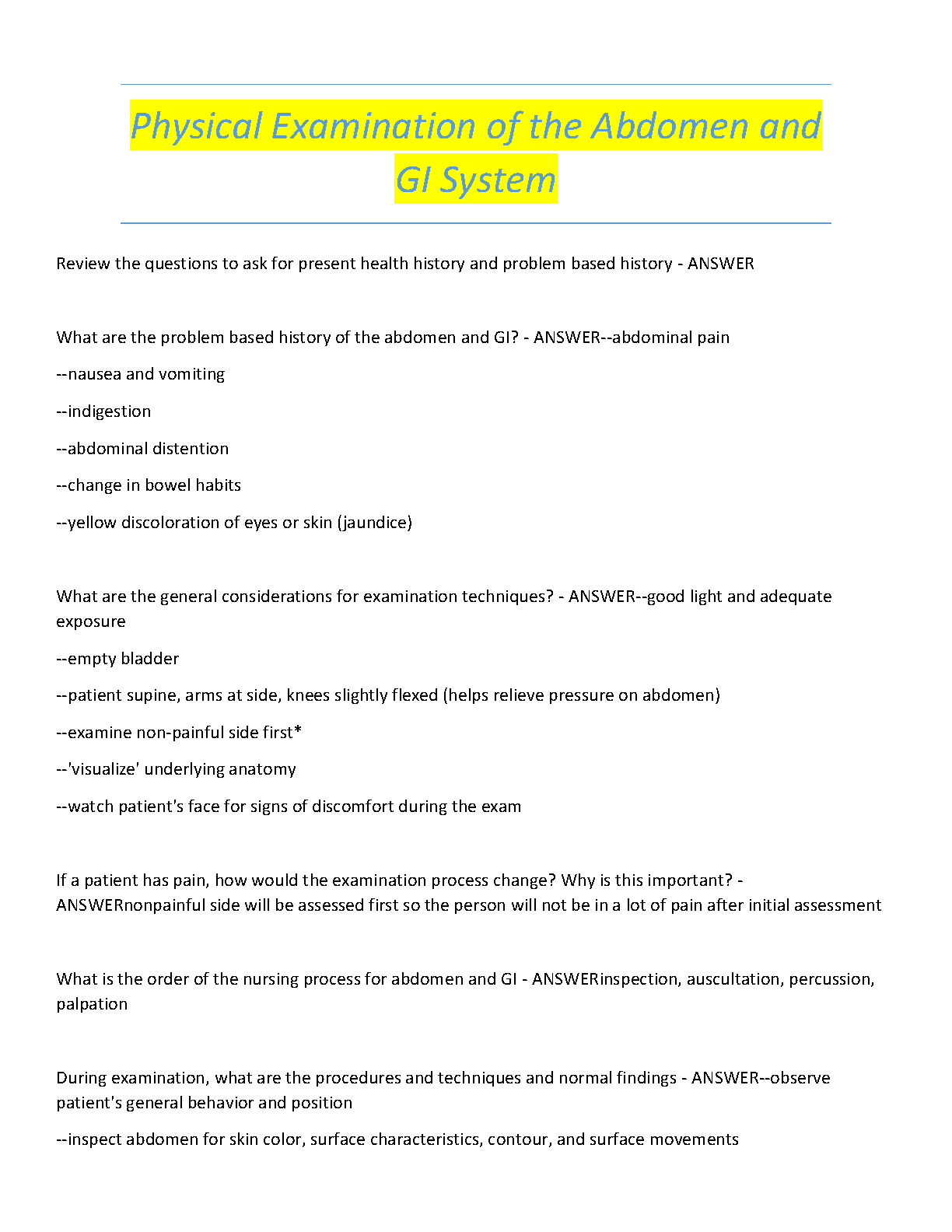 Unlock success in your nursing health assessment course with our latest 2025/2026 exam elaboration on the Physical Examination of the Abdomen and GI System. This comprehensive guide provides detailed answers to crucial questions covering everything from problem-based history taking (abdominal pain, nausea, jaundice) to essential examination techniques and the correct procedural order (Inspection, Auscultation, Percussion, Palpation). Master the key considerations for patient comfort and accurate assessment to excel in your exams and pass on your first attempt, avoiding costly resits.