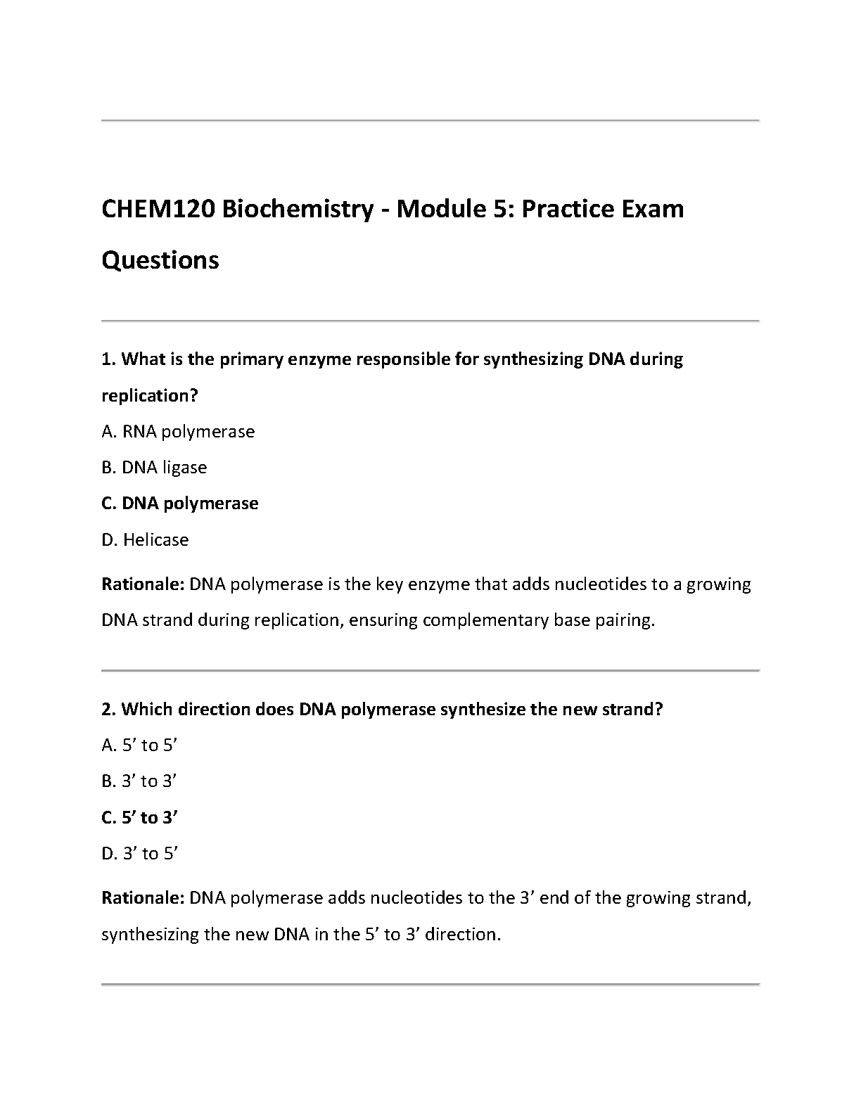 Master Module 5 of CHEM120 Biochemistry with this comprehensive test bank, updated for the 2025/2026 academic year. This essential study guide features a complete set of practice exam questions, each with a verified answer and detailed rationale. Dive deep into key topics like DNA replication and enzymatic functions to solidify your understanding. This resource is specifically designed to help you prepare effectively, boost your confidence, and pass your exams on the first attempt. Avoid resits and achieve academic success with our expertly crafted study materials.