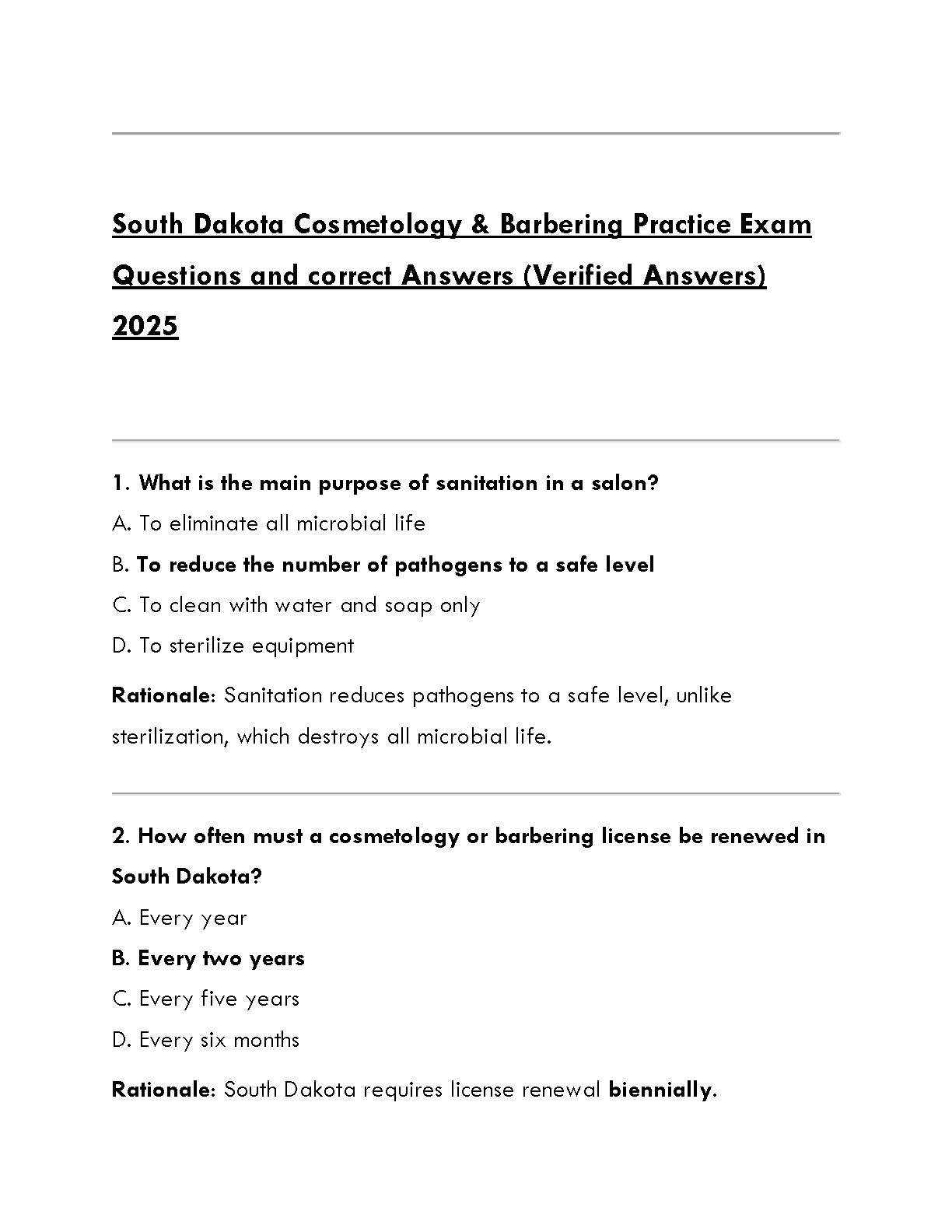 South Dakota Cosmetology & Barbering Practice Exam 2025 Test Bank | Verified Questions and Answers to Help You Pass on Your First Try