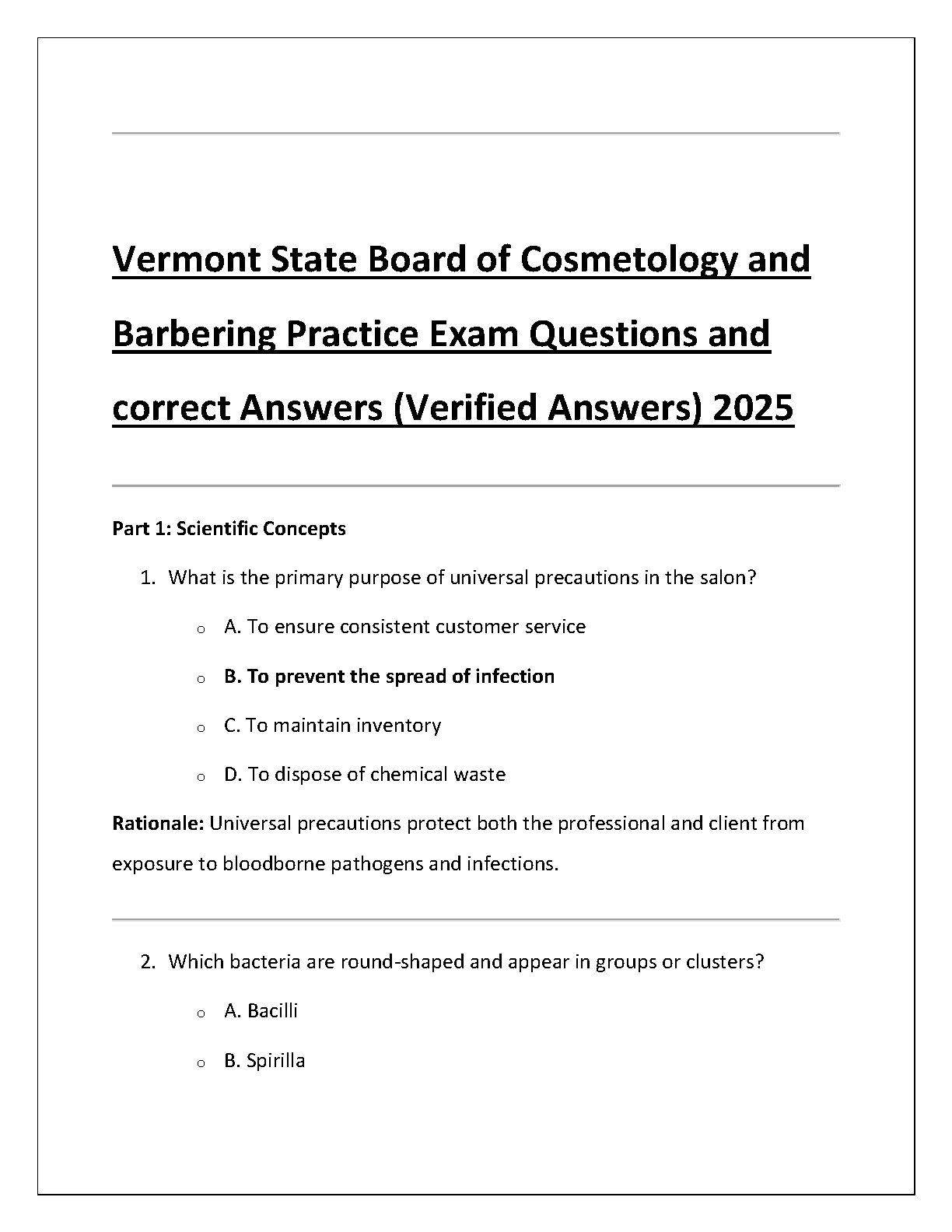 Ace your Vermont State Board of Cosmetology and Barbering exam with our comprehensive 2025 test bank. This essential study guide is packed with practice questions and verified correct answers, complete with detailed rationales to deepen your understanding. Covering all key topics, including scientific concepts like infection control, this resource is designed to help you prepare effectively, build confidence, and pass your licensing exam on the very first attempt. Get instant access to the ultimate preparation tool for your 2025 Vermont cosmetology and barbering certification.