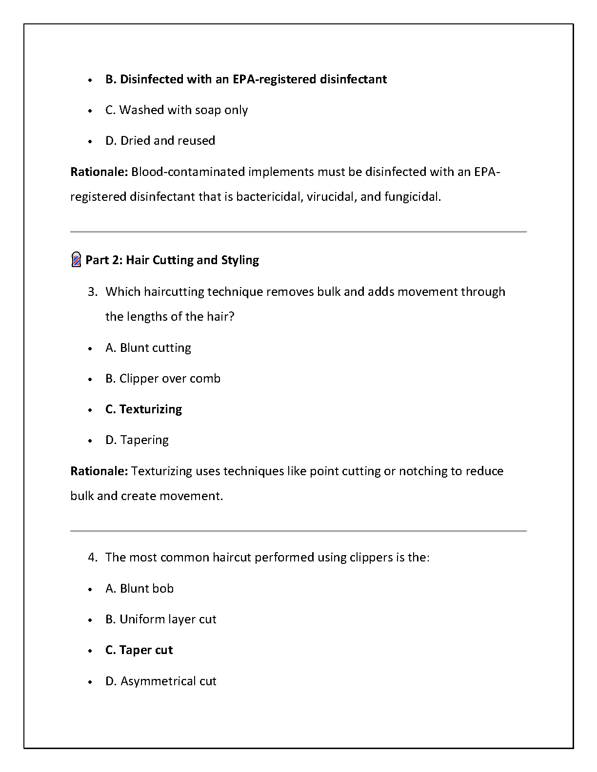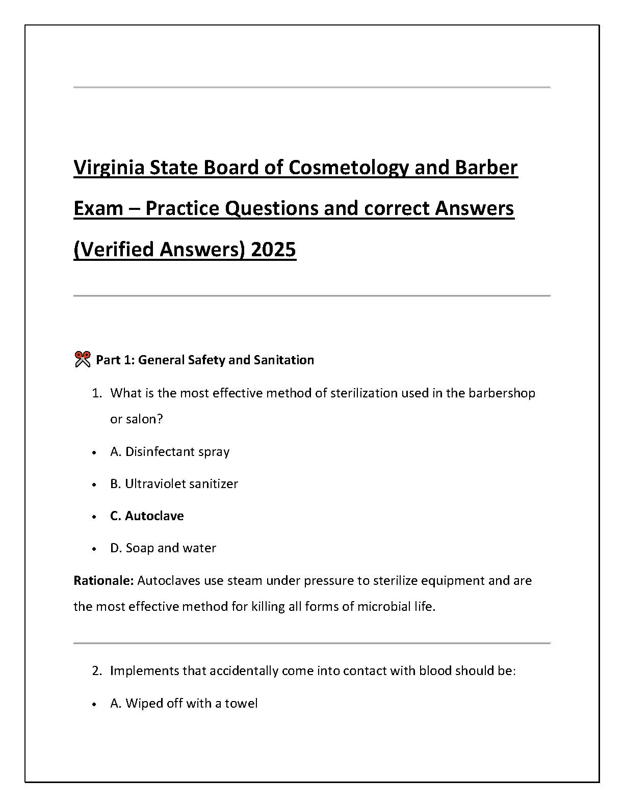 Ace your Virginia State Board of Cosmetology and Barber Exam with our definitive 2025 Test Bank. This essential study resource provides a comprehensive set of practice questions, complete with verified answers and detailed rationales, covering all key topics like General Safety and Sanitation. Designed to mirror the actual exam, this guide is your best tool to study effectively, build confidence, and pass on your first try. Secure your professional license without the stress of retakes. Get instant access now!