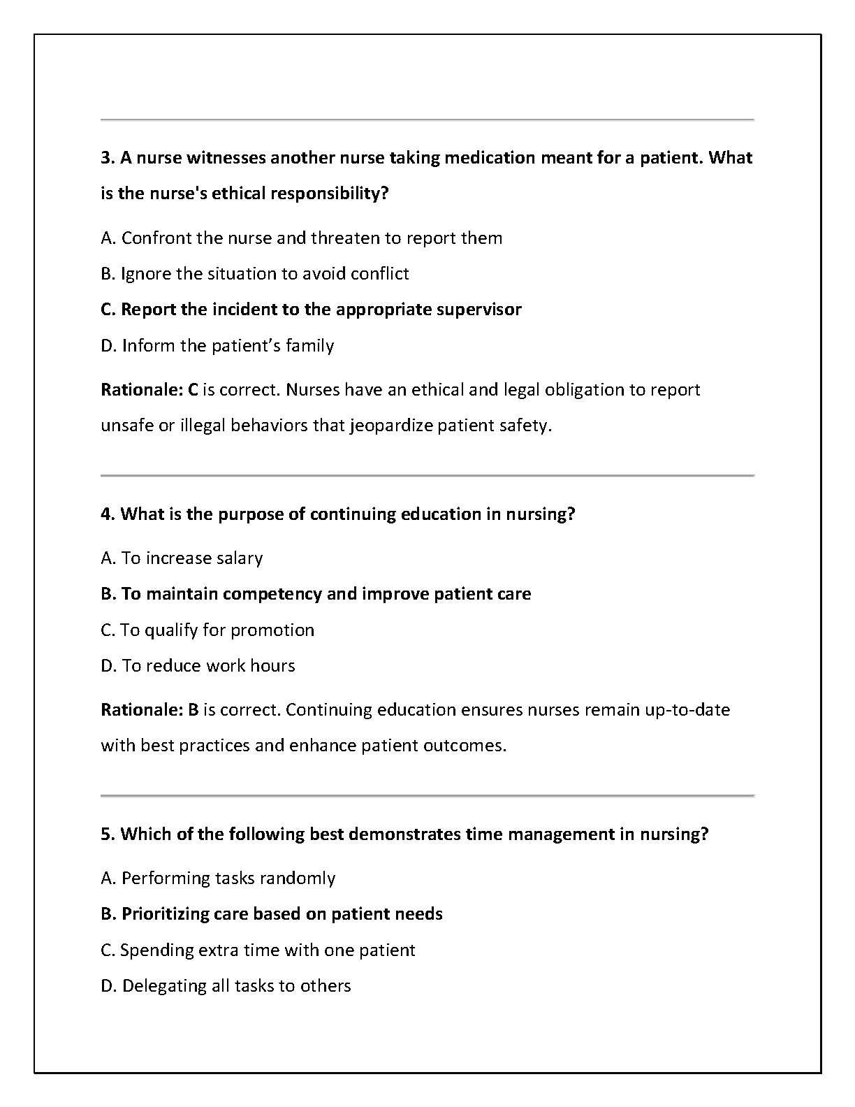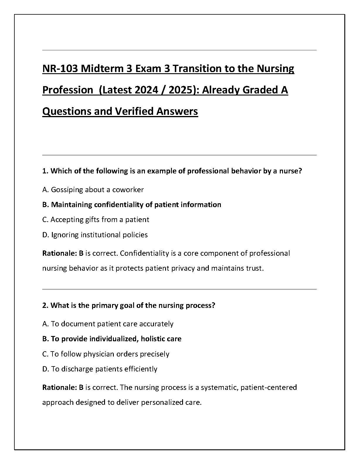 Master the NR-103 Midterm 3 Exam with our comprehensive test bank for 'Transition to the Nursing Profession.' This 2024/2025 updated guide features a full range of questions, each with a verified answer and a detailed rationale to deepen your understanding. It's the ultimate study resource designed to help you ace your exam, grasp core professional nursing concepts, and succeed in your course. Get instant access and start studying smarter today!